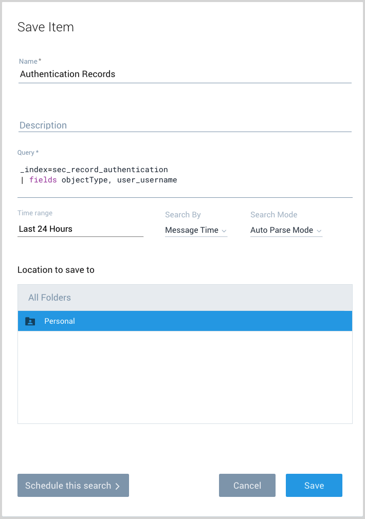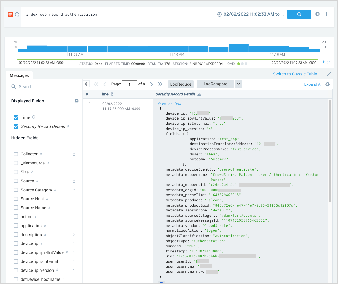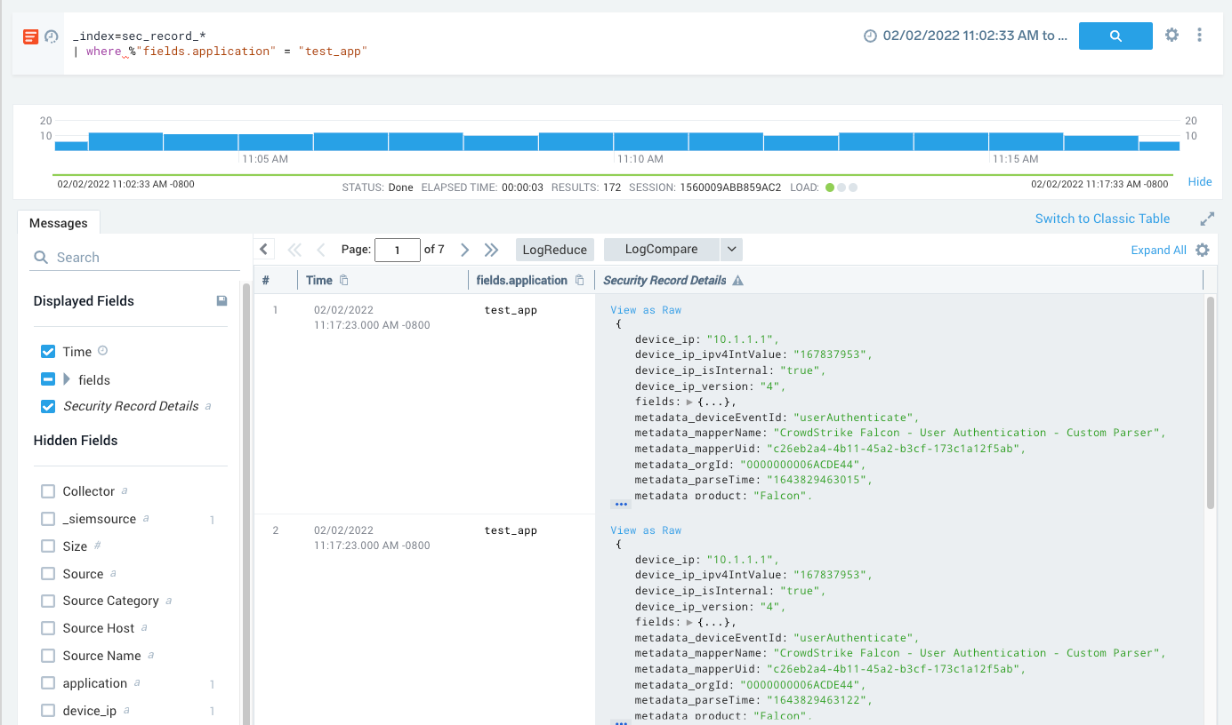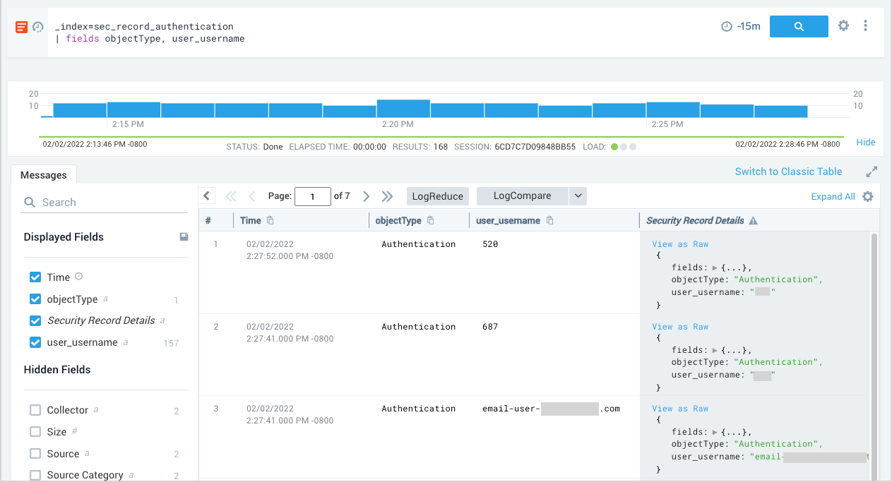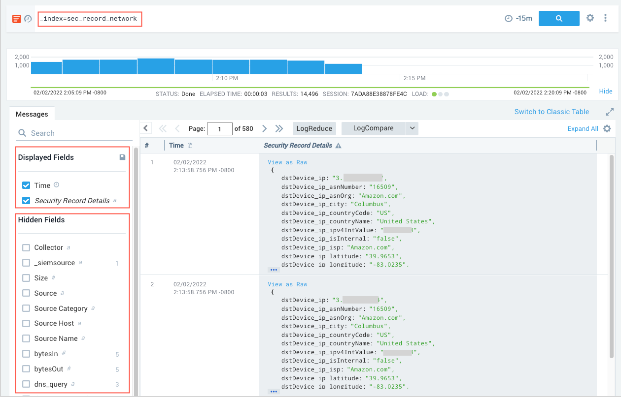 When you query Cloud SIEM records or signals in a Sumo Logic log search tab, the contents of each record or signal are presented in a field named Security Record Details. The Security Record Details is somewhat unique in that it cannot be referenced in a query itself. It is a read-only field. Note however, that you can add subfields of the Security Record Details field as separate columns in the field browser. You can see an example of doing that in Save a query with predefined display fields below. And like any other field, you can hide the Security Record Details field, if desired.