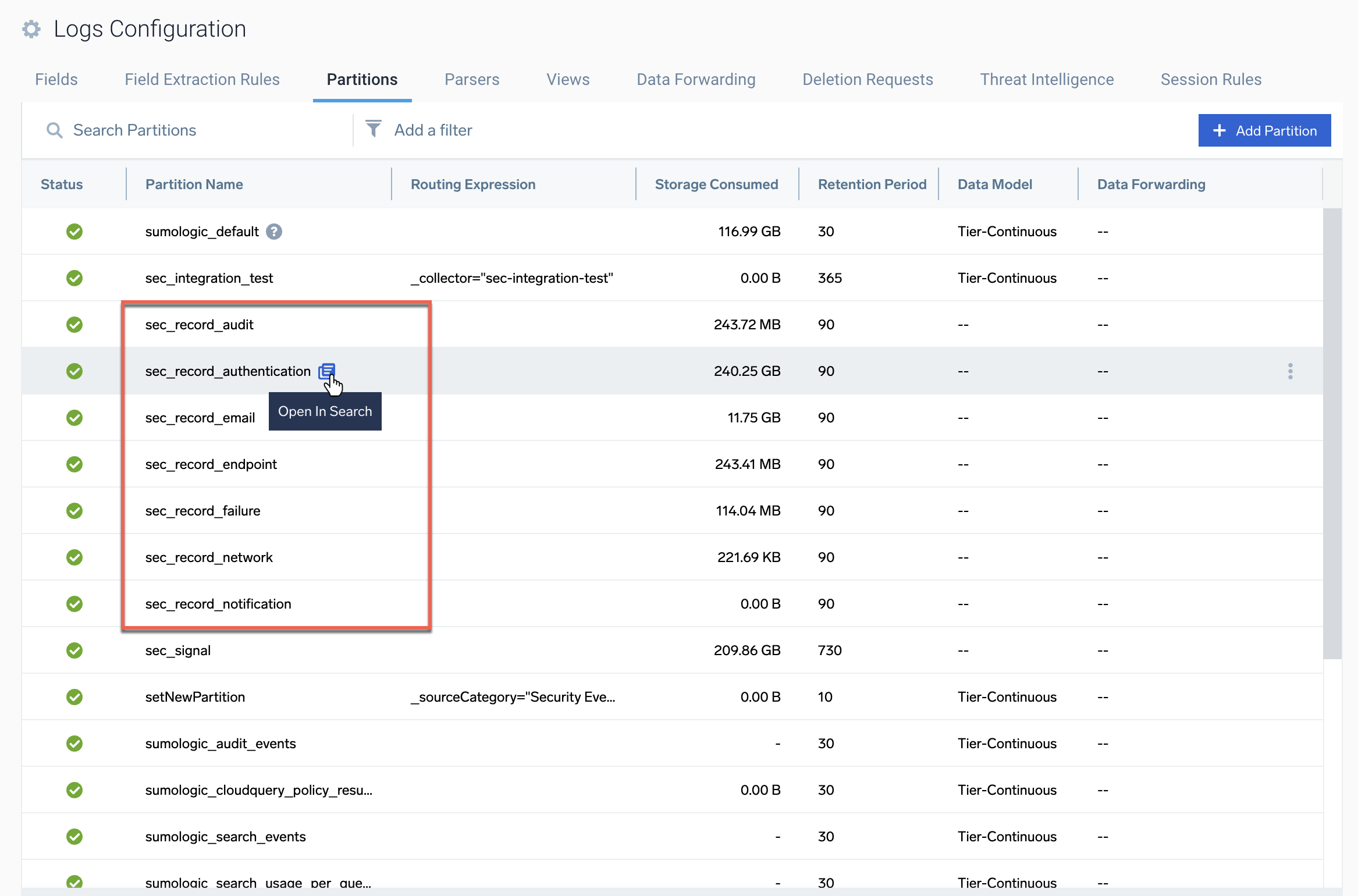 Classic UI. In the main Sumo Logic menu, select Manage Data > Logs > Partitions. - The partitions that contain Cloud SIEM records begin with the string "sec_record".