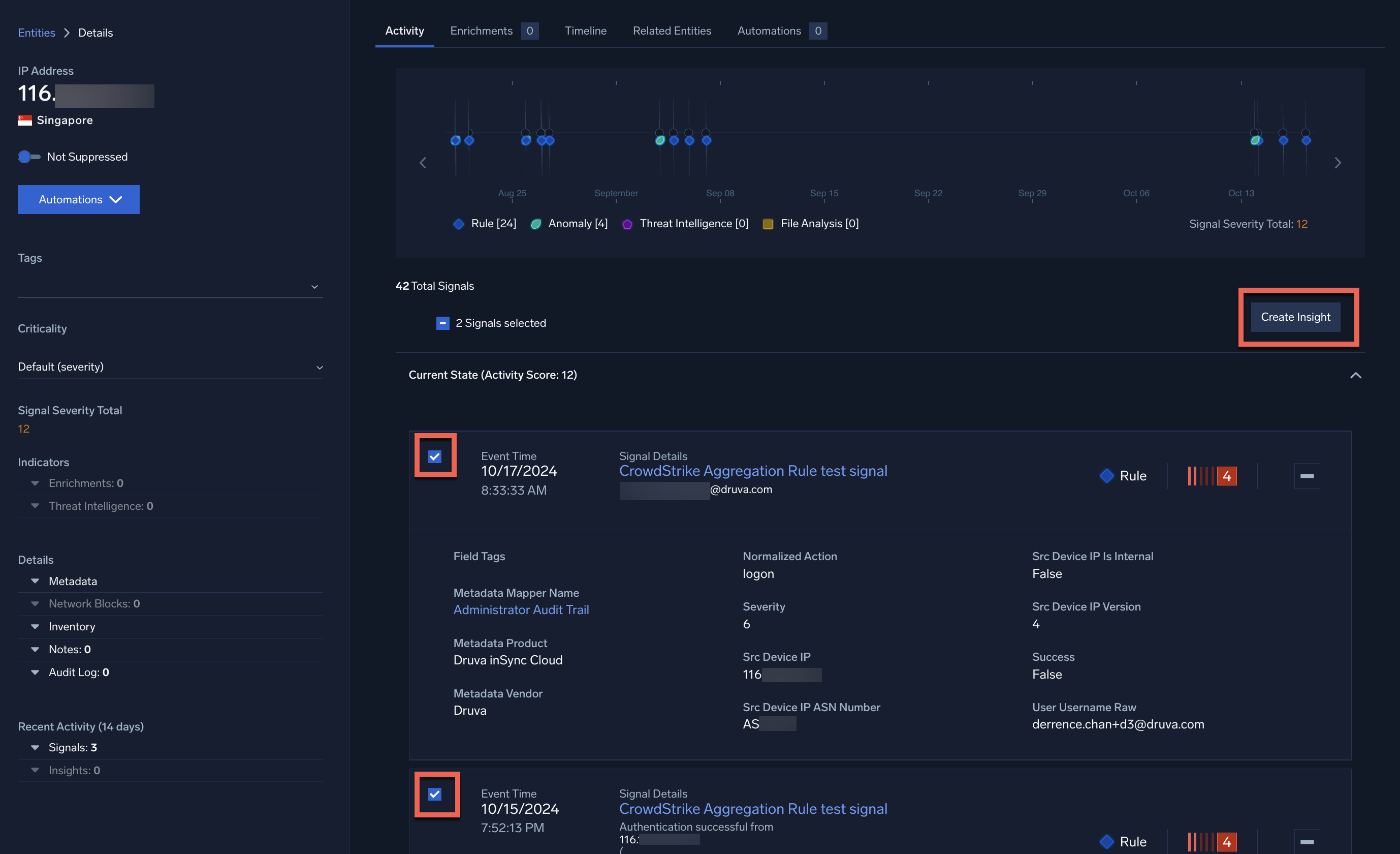 You can create an insight for an entity based on one or more signals on the entity. To do so, checkmark each signal you want to include in the insight, and click Create Insight.