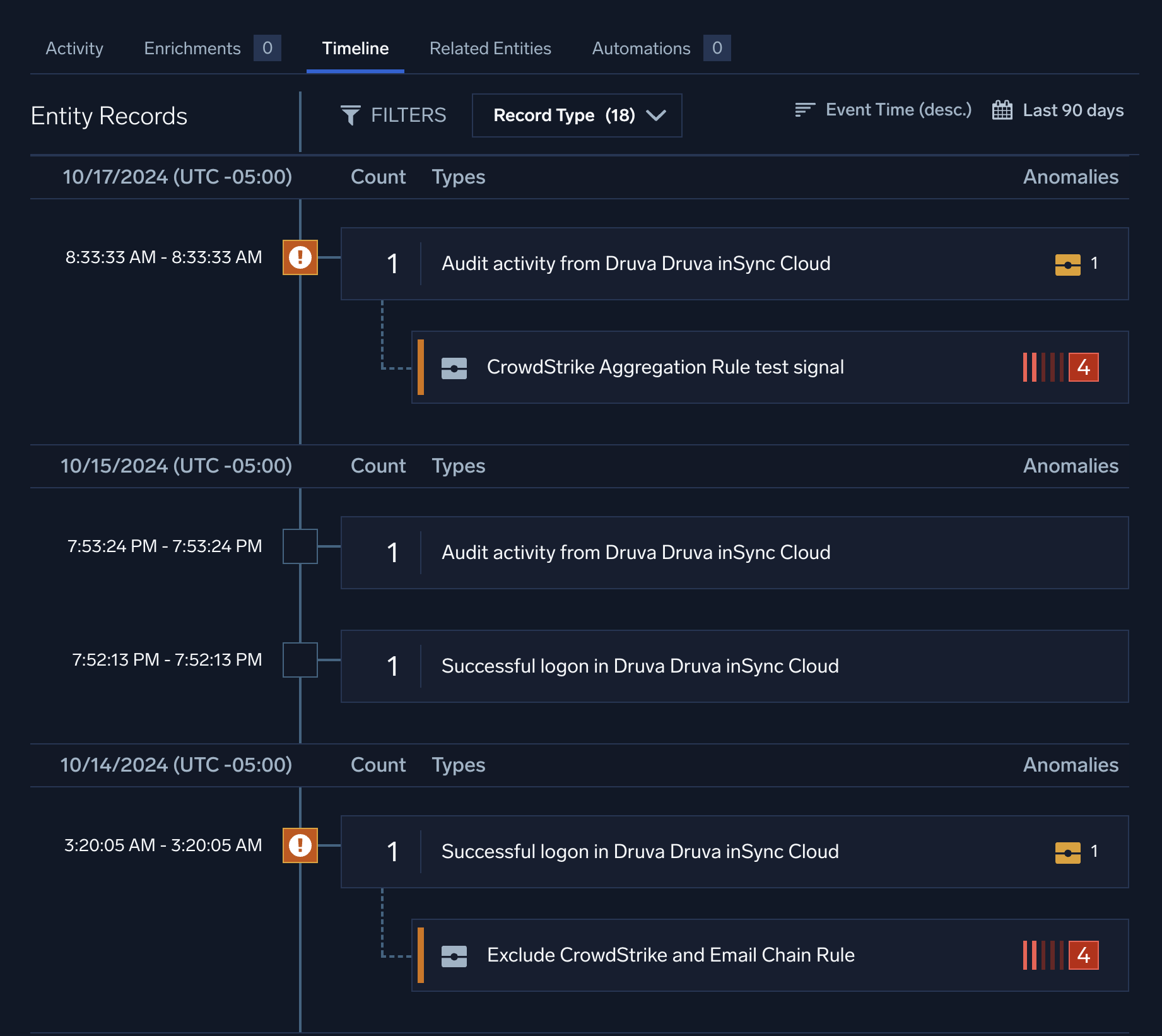 The Entity Timeline tab provides visibility into entity inventory data, entity relationships, records, signals, and insights over a default three-day time period. This view gives information about what else the entity doing before, during, and after signals and insights involving the entity were generated.