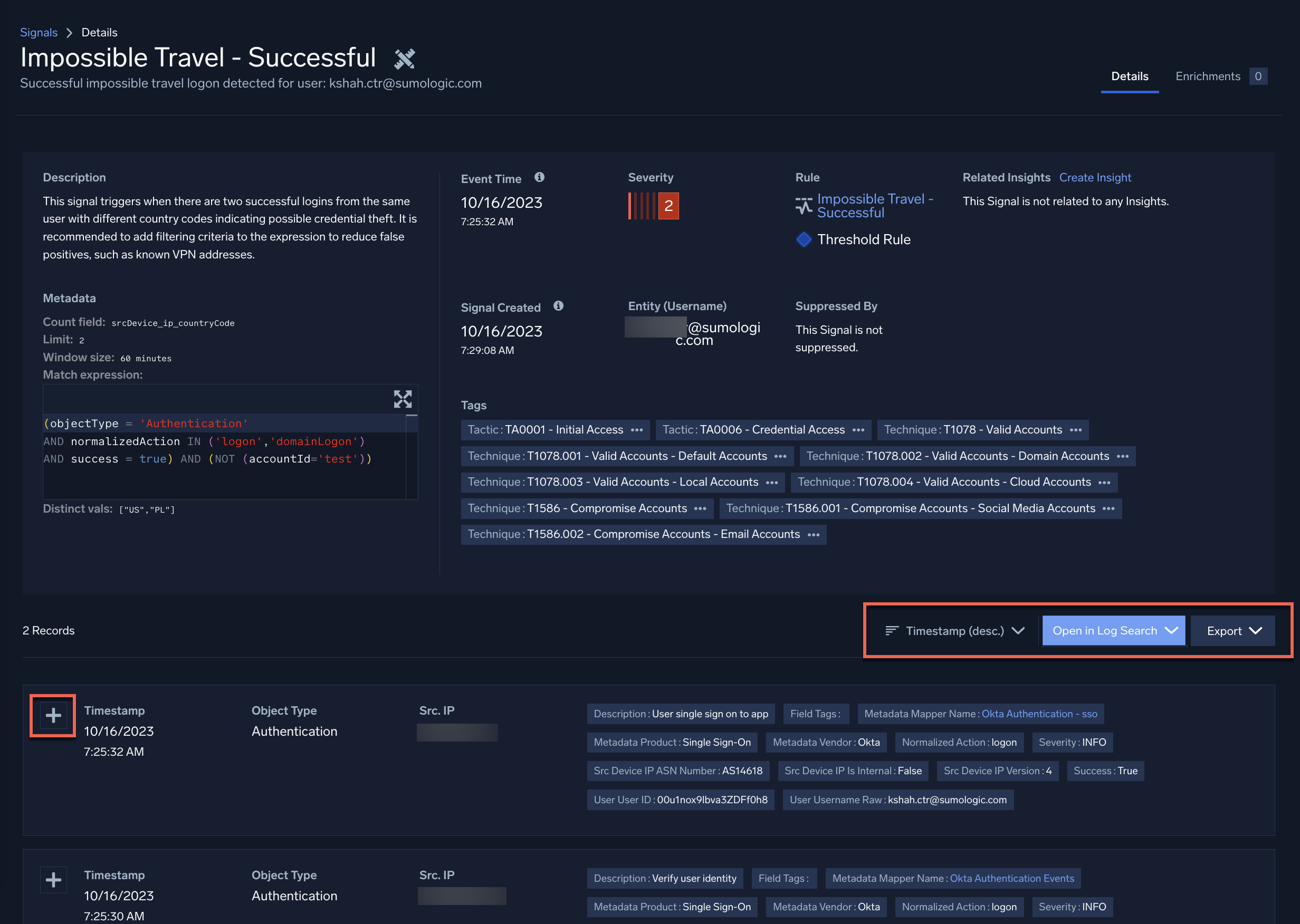 When you view the details page for a signal that was triggered by a threshold, aggregation, or chain rule, you’ll see a section that displays records that matched the rules conditions. These records will continue to be associated with the signal as long as the signal is available. - Click the plus sign (+) for a record to view its details.