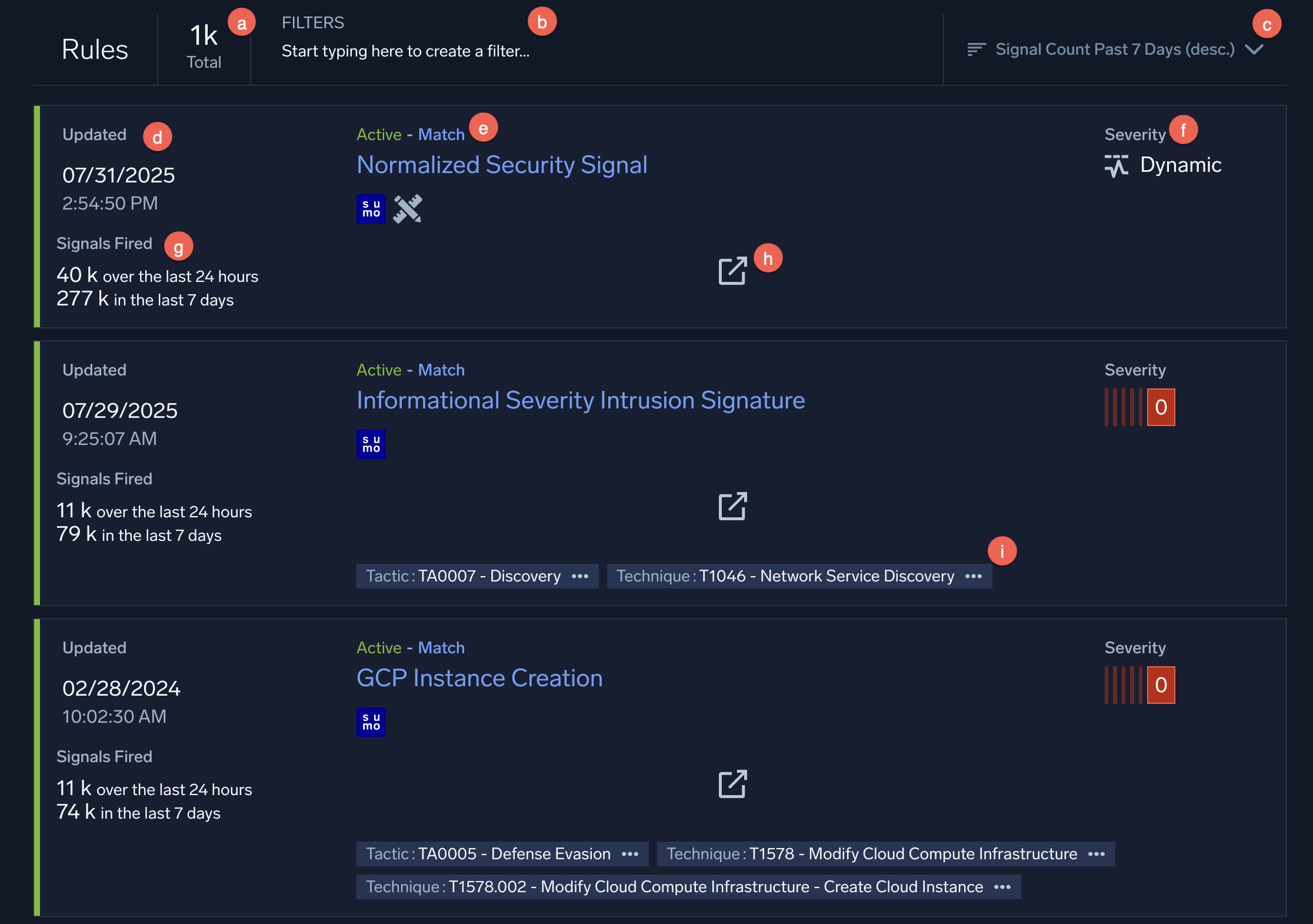 | g | Signals Fired. The number of signals that the rule fired in the last 24 hours as well as 7 days. |