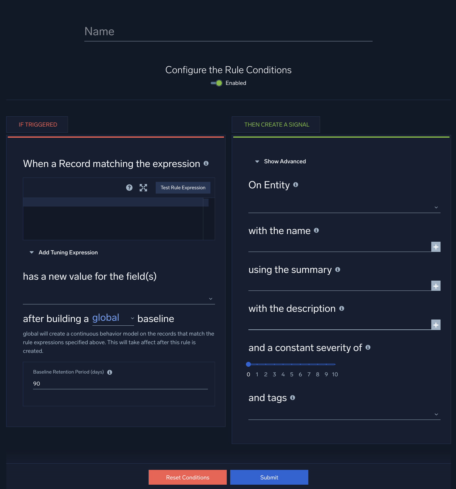 If you are unsure whether to use a per-entity or a global baseline, consider your use case. If you’re inclined to select user_username in the Has a new value for the field(s) prompt, you’re better off creating a global baseline for that behavior. Alternatively, if you want to track a new value for a non-entity record field, a per-entity baseline is appropriate.
