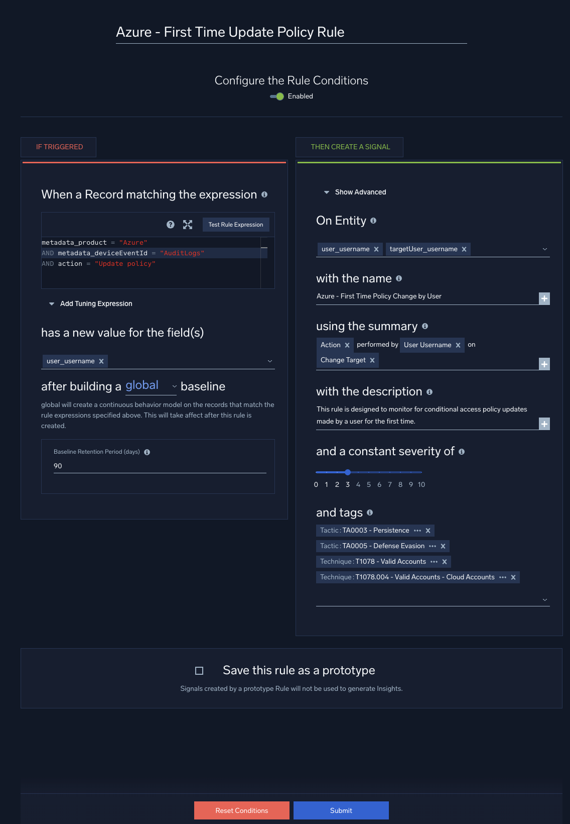 A first seen rule is different from other Cloud SIEM rule types in that you don’t define the criteria for firing a signal. Instead, the rule expression in a first seen rule is simply a filter condition that defines what incoming records the rule will apply to. For each first seen rule, Cloud SIEM automatically creates a baseline model of normal behavior for a defined time period (by default for the last 90 days) evidenced by records that match the Rule Expression. The activity found during this period is considered normal behavior and will not be alerted on.