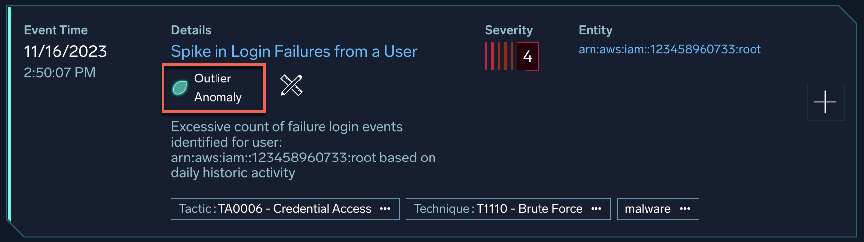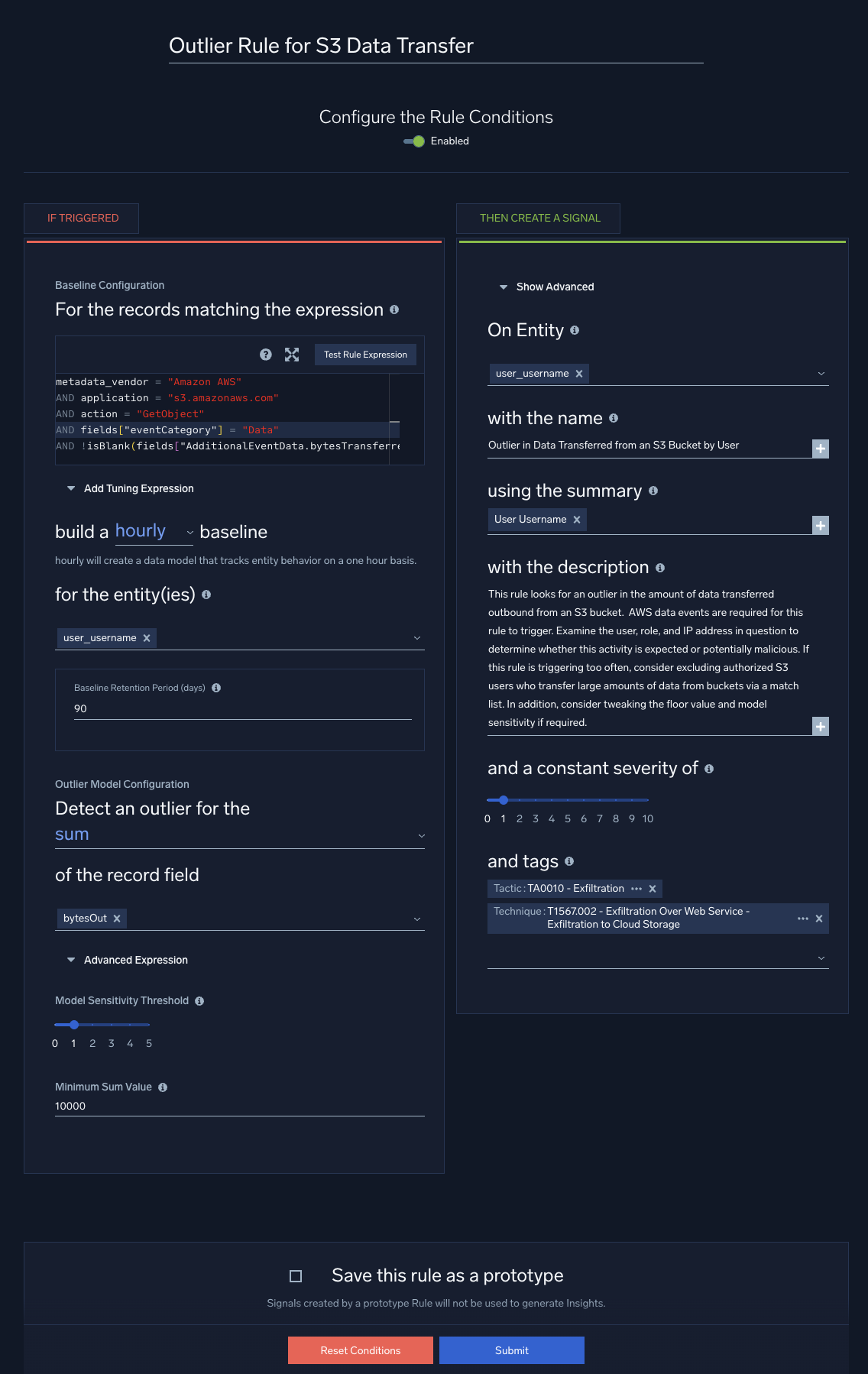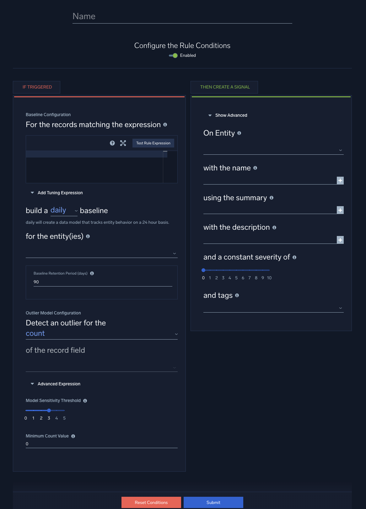 Outlier rules allow you to generate a signal when behavior by an entity (such as a user) is encountered that deviates from its baseline activity.