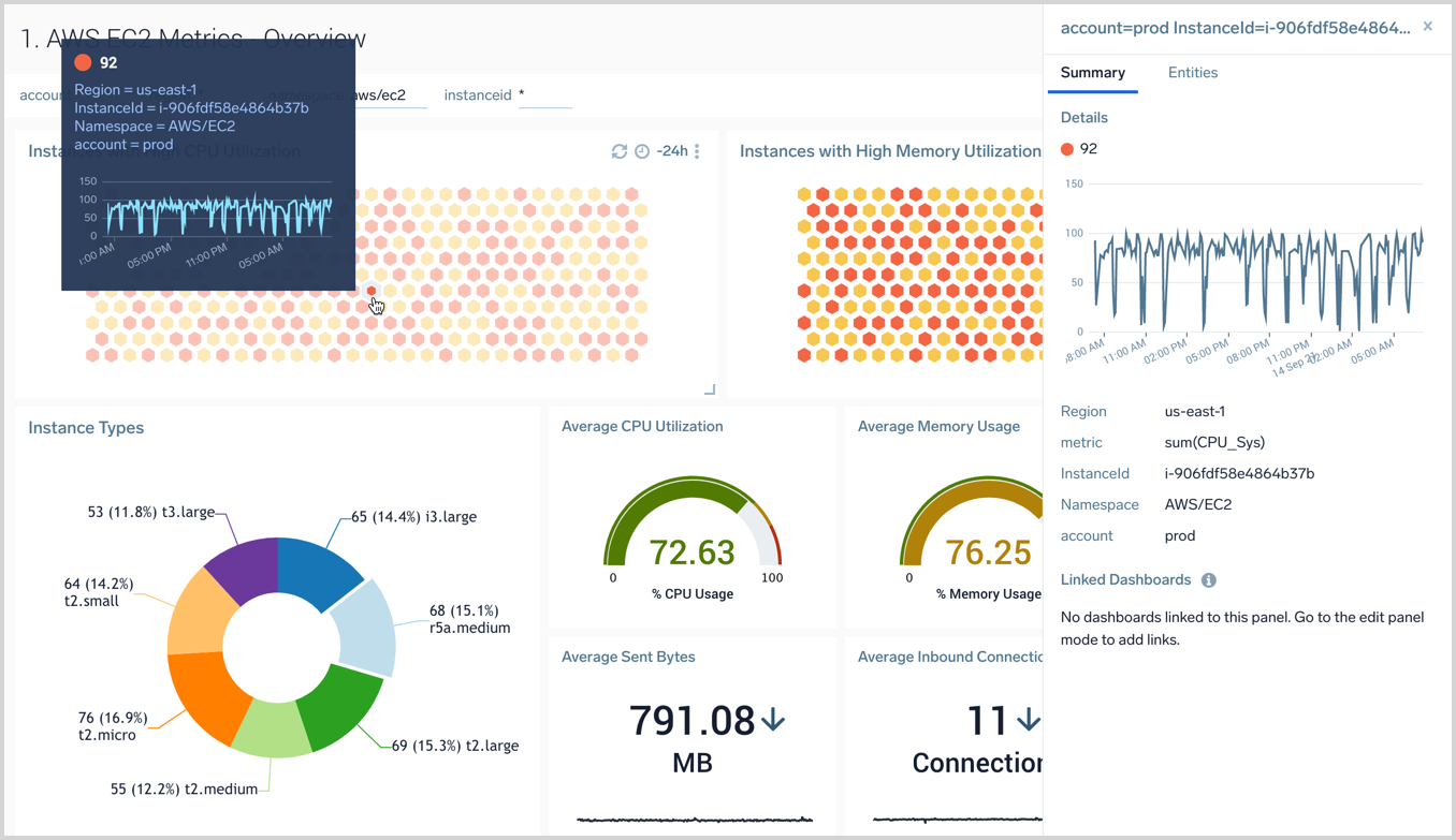 A metrics data Summary tab includes links to any Linked Dashboards.