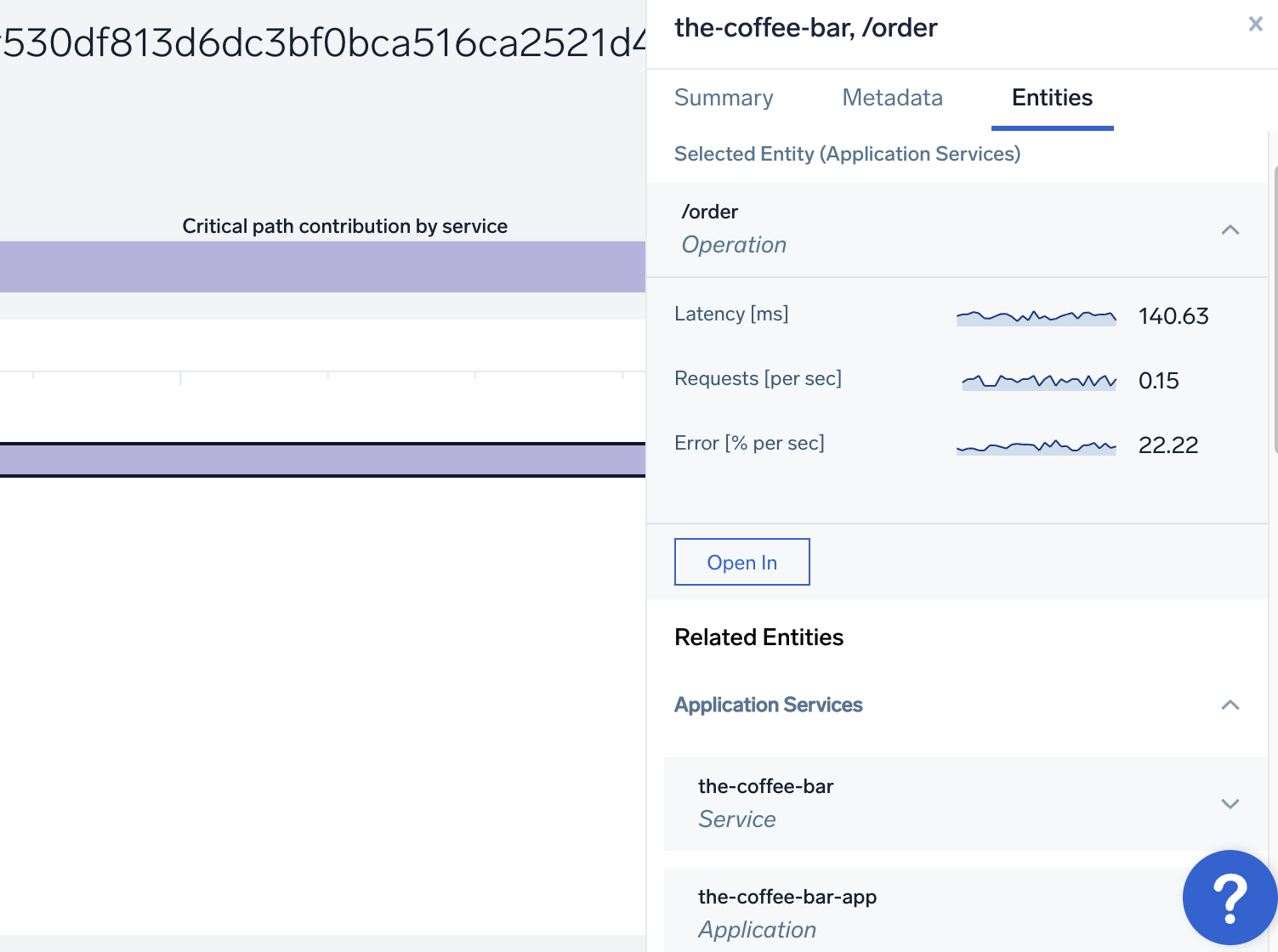 To investigate, click the Open In button and select an icon to launch another feature against the entity or environment. An icon is not available if it is not a valid launch.