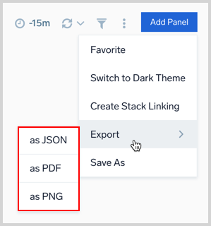 - Click the format you want to export the Dashboard as, either JSON, PDF, or PNG.