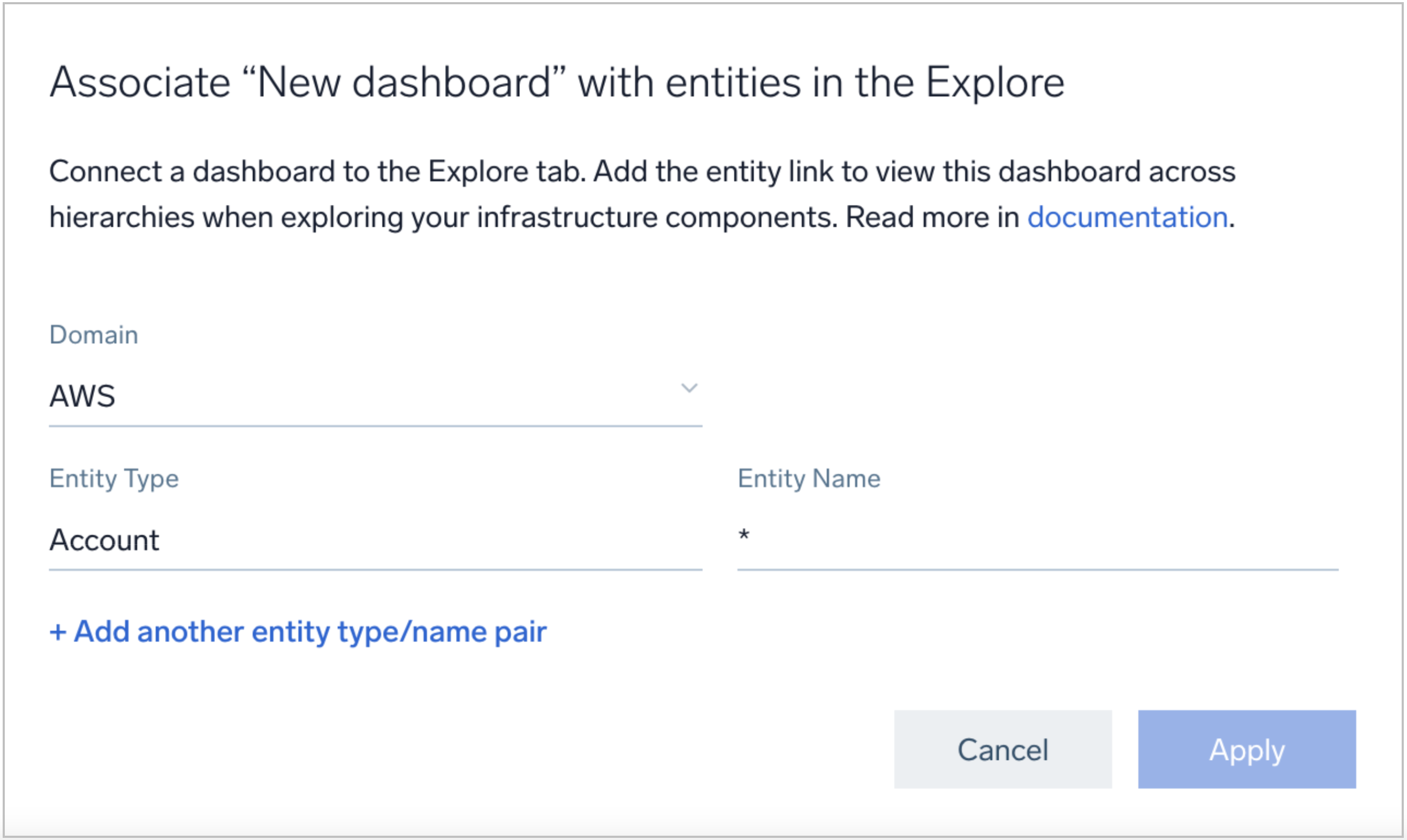 - If you would like to further specify for which entities of a given type the dashboard is displayed, you can input the relevant Entity Name (as displayed in the monitoring dashboards tab). If you would like to see the dashboards for all entities of a given type, you can use (