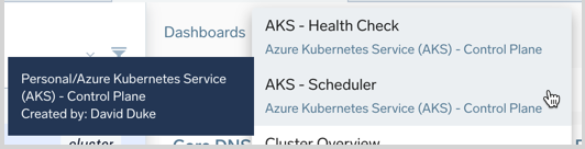 From the Dashboards dropdown menu, select the name of the linked dashboard to load it in monitoring dashboards. When hovering over available dashboards the tooltip provides the location and creator so it is easier to identify.