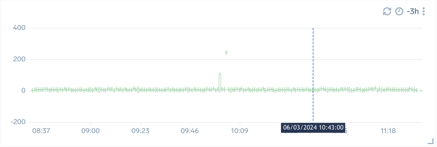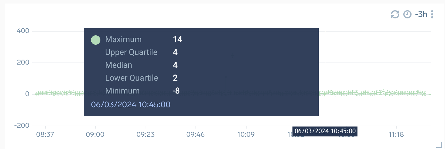 When you move the cursor over the Line, Column, Bar, Area, and Box Plot time series panels, you can see a crosshair line across the panel which displays the time-series data. If other time series panels are also configured with overlapping time range, then when you hover over one time panel, crosshair timestamp will be displayed on the other panels as well. A tooltip is used to display the time-series data along with the crosshair, which also displays information about the combination chart.