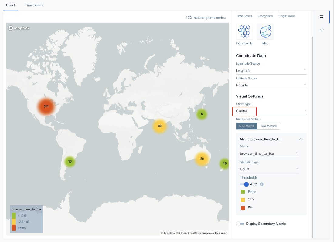 - Map charts queries have a display limit of 1440 results. If your query exceeds this limit, consider refining your query to see all results in the chart.