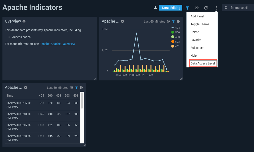 - [User's] data access level. This option is available when you set the data access level for a dashboard whose current access level is other than your own. In the option text, [User's] is replaced by the name of the user whose search role filter is currently applied to the dashboard.