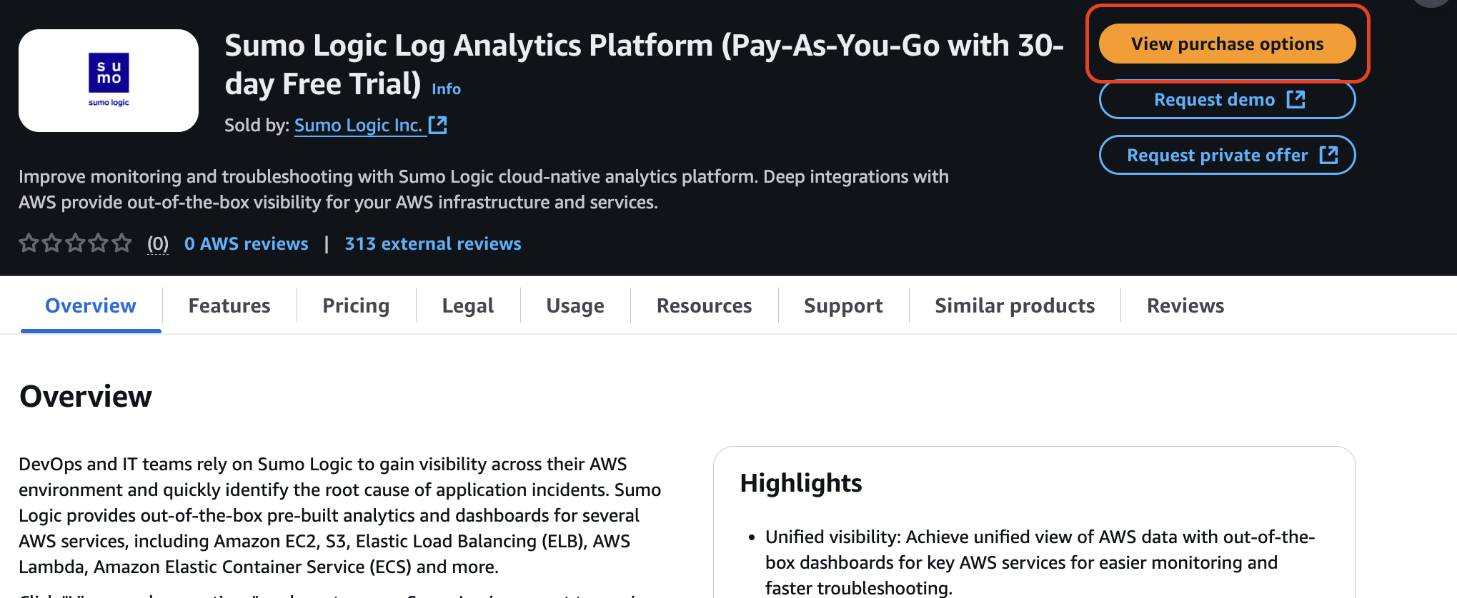 - Sign in to the AWS Marketplace, search for "Sumo Logic", and then click the subscription option of your choice. To sign up with an initial 30-day free trial, select Sumo Logic Log Analytics Platform (Pay-As-You-Go with 30-day Free Trial) highlighted below.