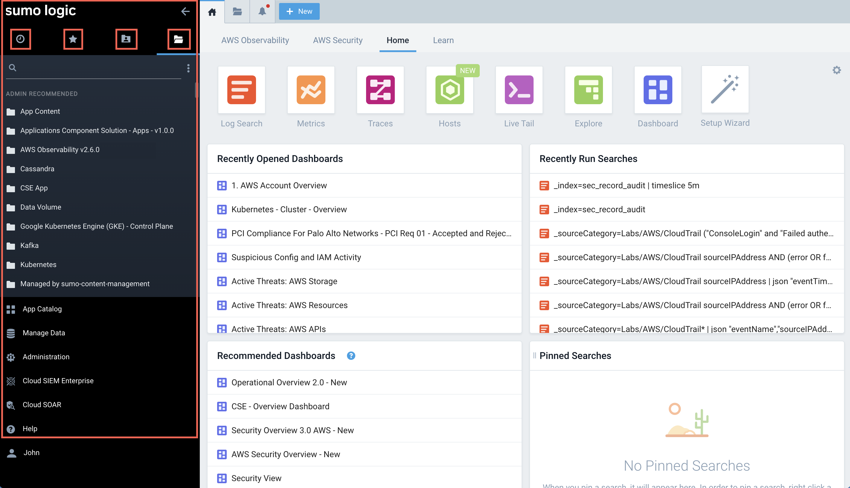 When you first log in, you'll land on the Sumo Logic Home page. The left nav menu bar is a one-stop location where you can access the following:
