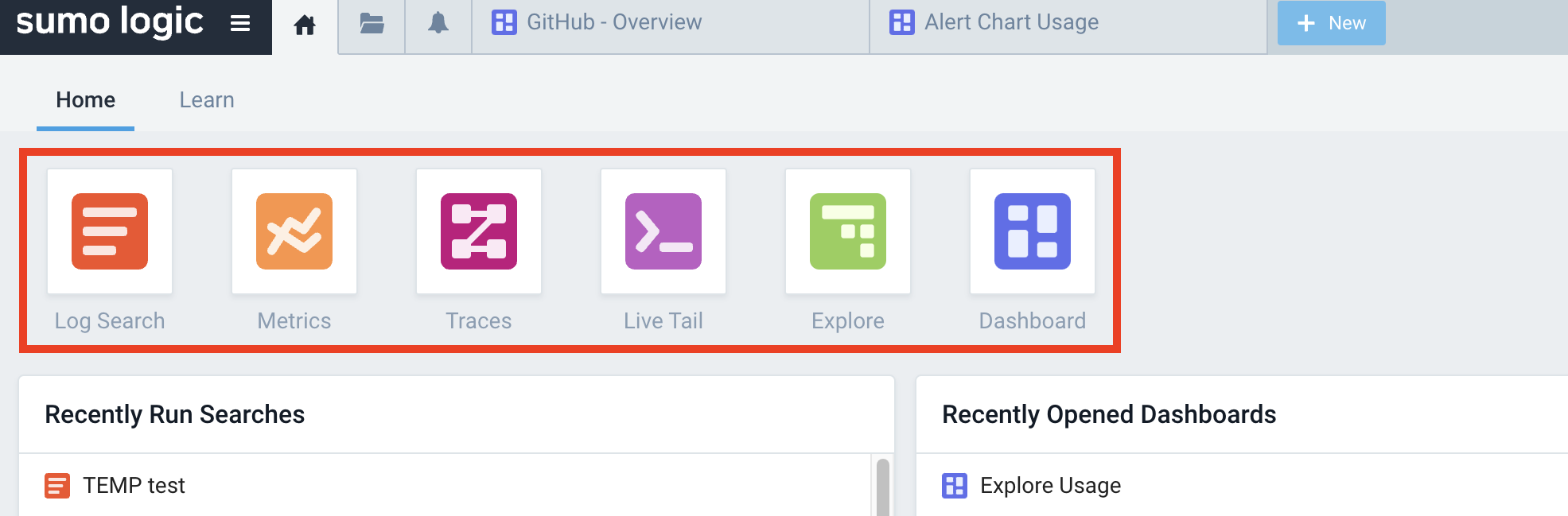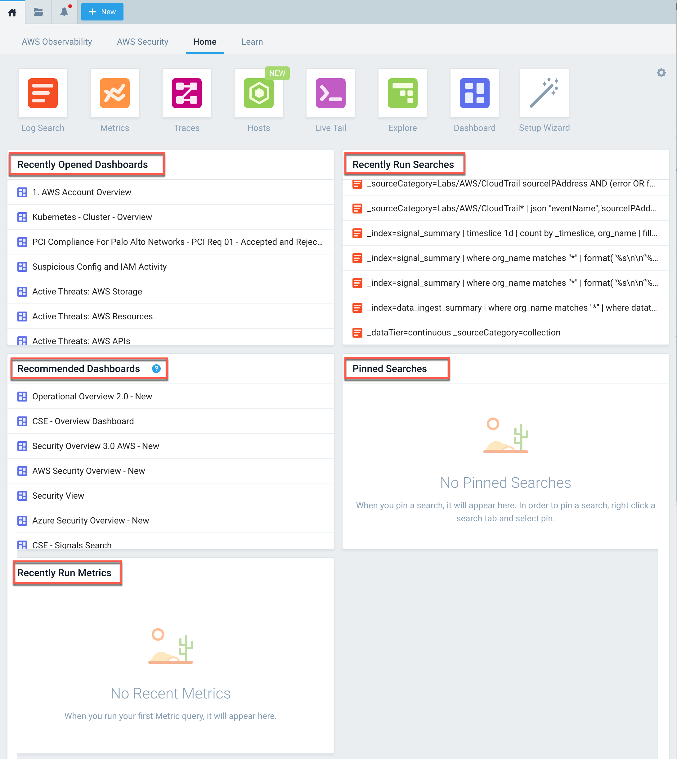 You see the Home landing page when you first sign in to Sumo Logic. The Home page provides an at-a-glance view of the following: