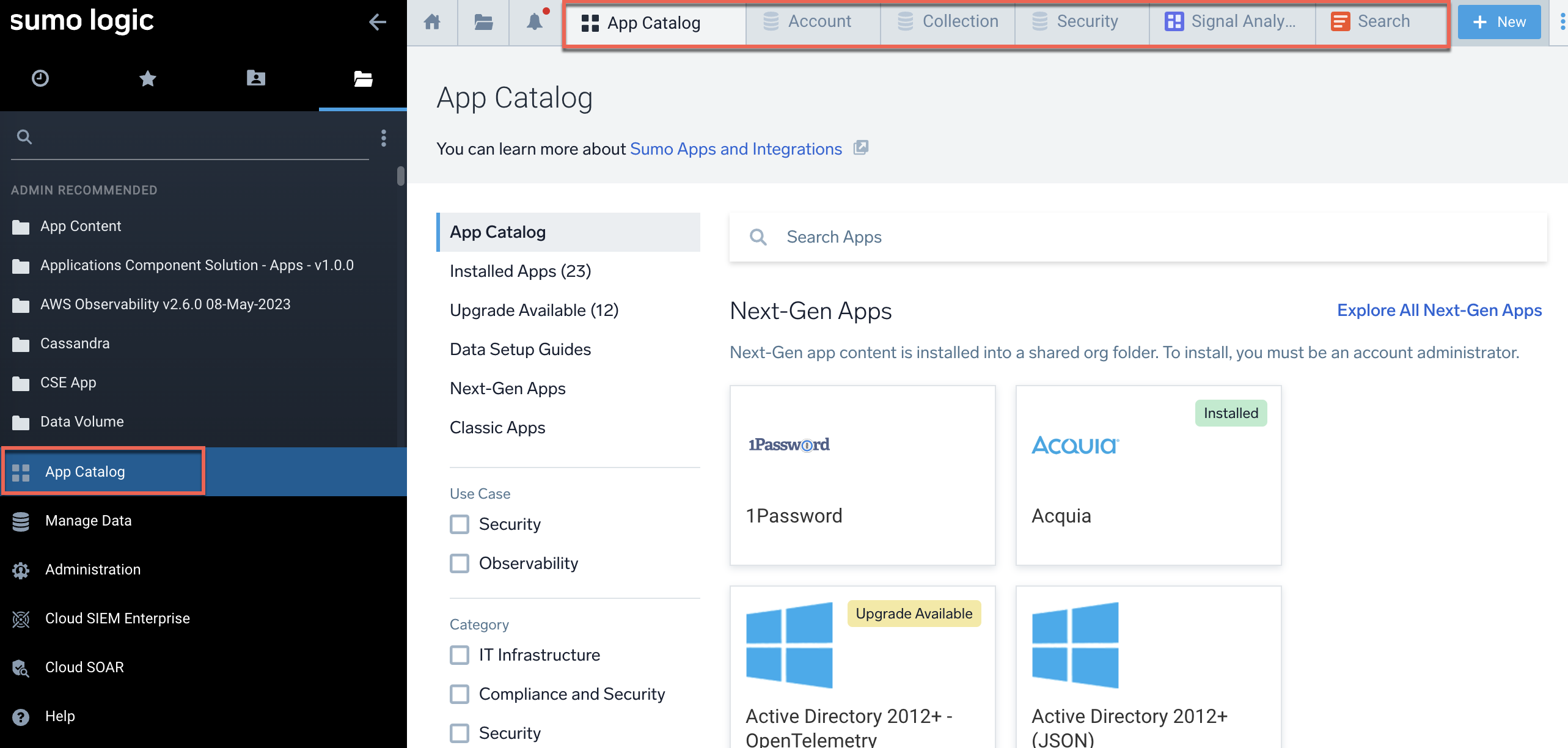 - Account. View information about your organization's Sumo Logic subscription, enable and manage the data volume index, manage billing.