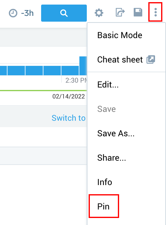 Log Search, Metrics, and Live Tail tabs have additional options you can use to customize your environment. The tabs even stay open when you sign out and sign back in again, so you can start where you left off. Clicking any of the following icons opens a tabbed window.