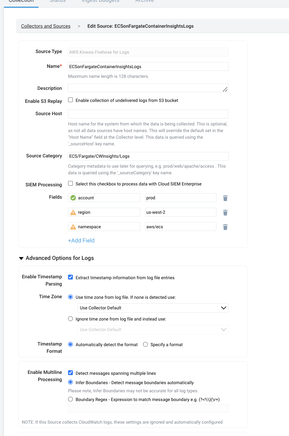 - Configure an AWS Kinesis Firehose for Logs Source. Add the fields account, region and namespace as shown below.