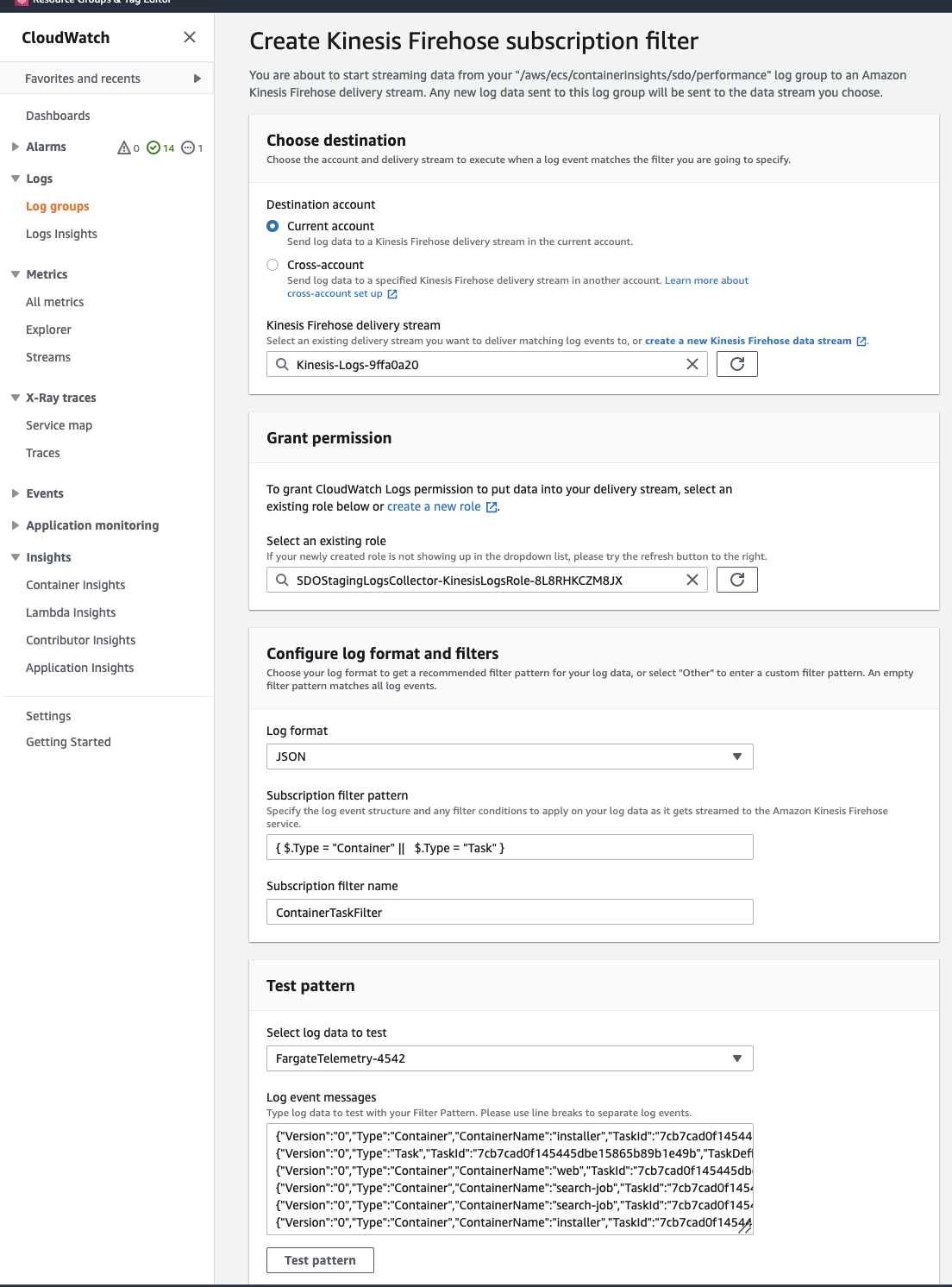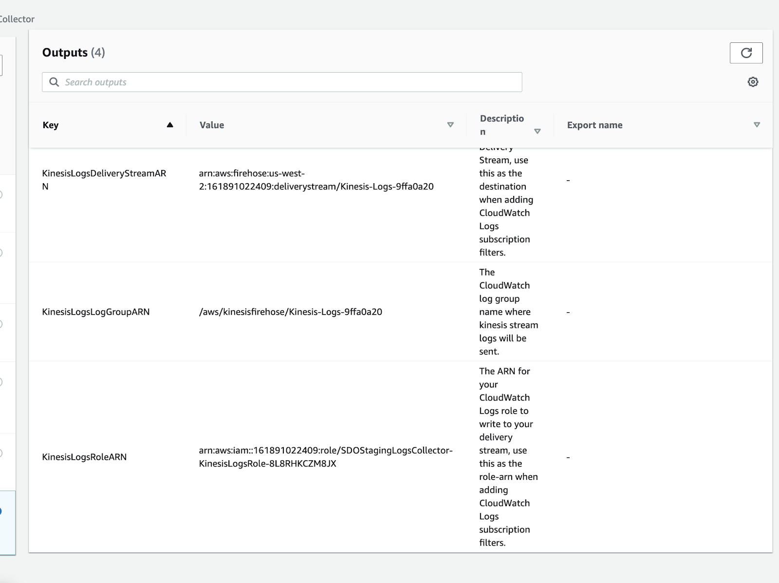 KinesisLogsRoleARNandKinesisLogsDeliveryStreamARNvalues from the outputs tab of Cloudformation.