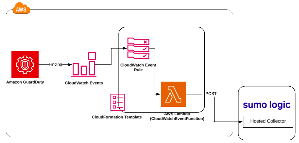 - A CloudWatch events rule enables CloudWatch to send events for the GuardDuty findings to the Sumo CloudWatchEventFunction Lambda function.
