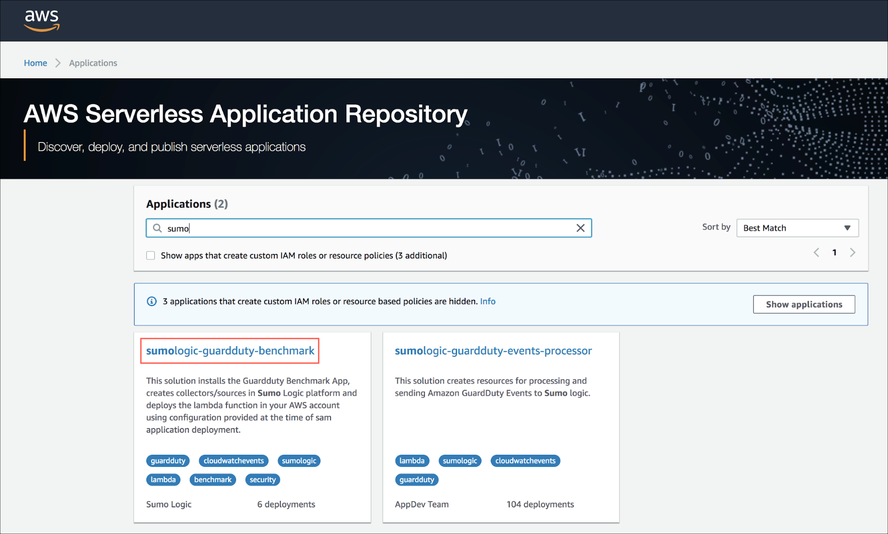 - Search for sumologic-guardduty-benchmark and click the app link when it appears.