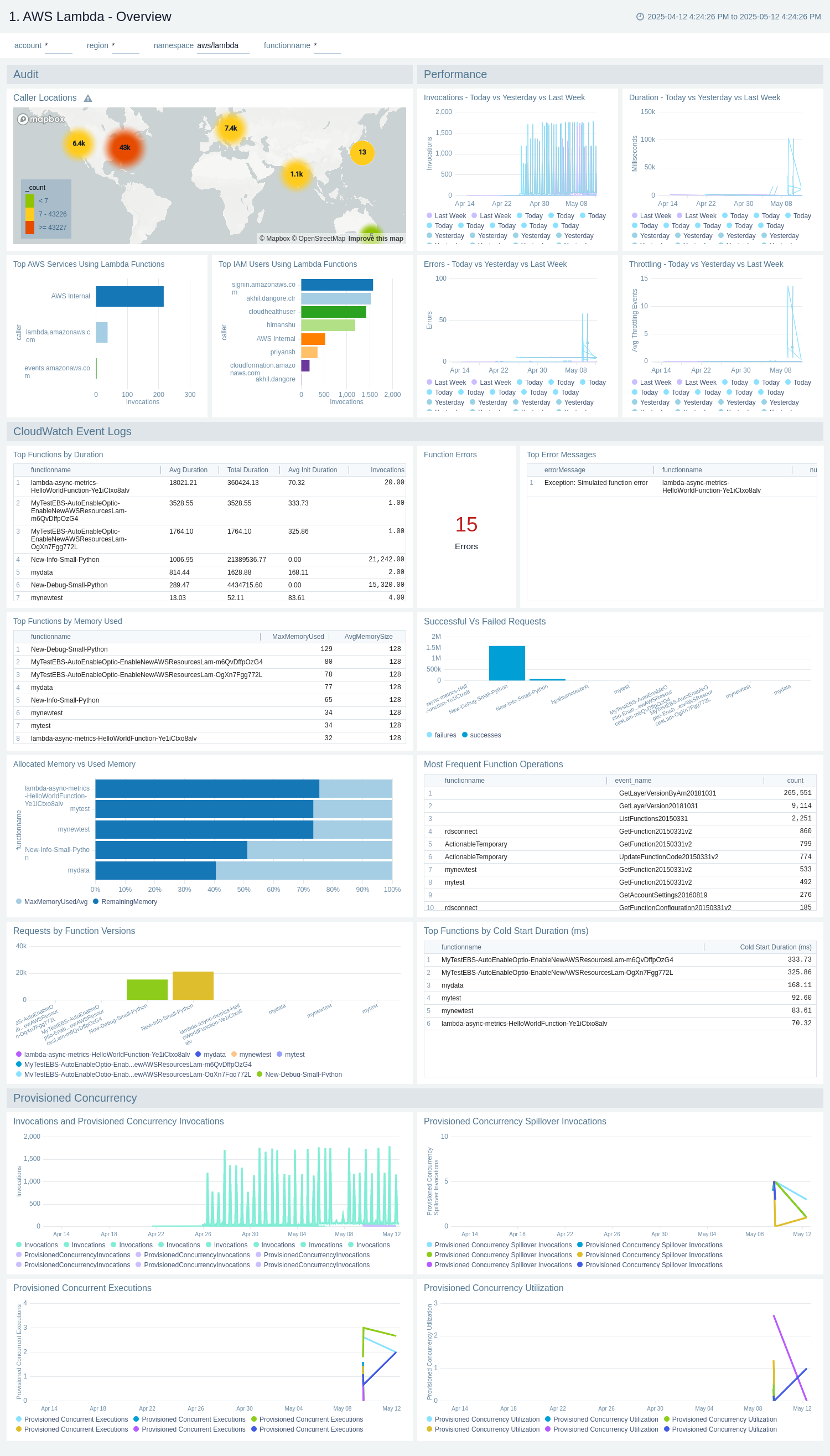 The AWS Lambda - Overview dashboard provides intuitive insights with CloudWatch Lambda metrics, CloudTrail audit logs for Lambda, as well as Lambda logs to give you an at-a-glance view of actions, performance, and health of your AWS Lambda functions.