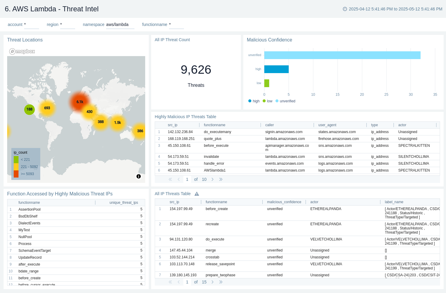 AWS Lambda - Threat Intel dashboard provides insights into incoming requests to your AWS Lambda functions from malicious sources determined via Sumo Logic threat intelligence. Panels show detailed information on malicious IPs and the malicious confidence of each threat.