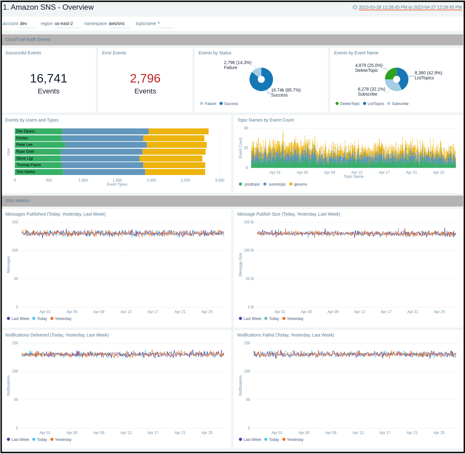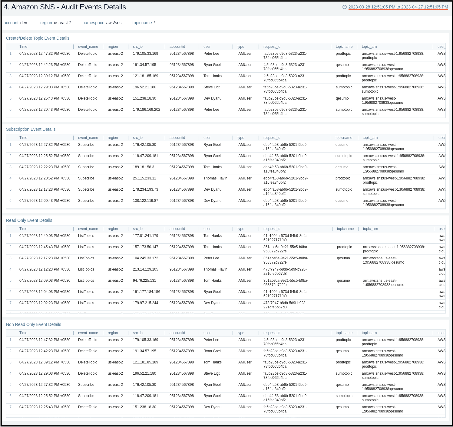 The Amazon SNS - Audit Events Details dashboard provides insights across topics, subscriptions, read only and non read only events.