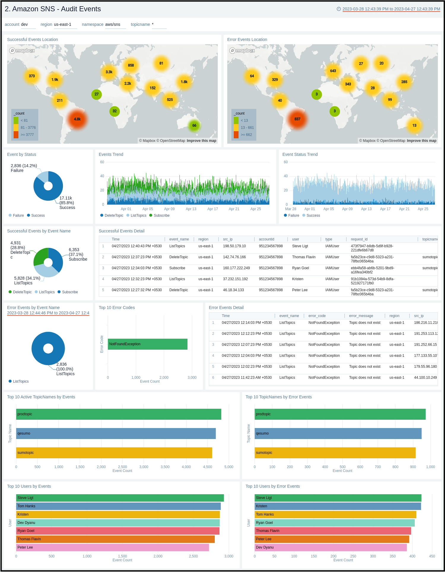 The Amazon SNS - Audit Events dashboard provides insights across CloudTrail events across location, status, and topic names.