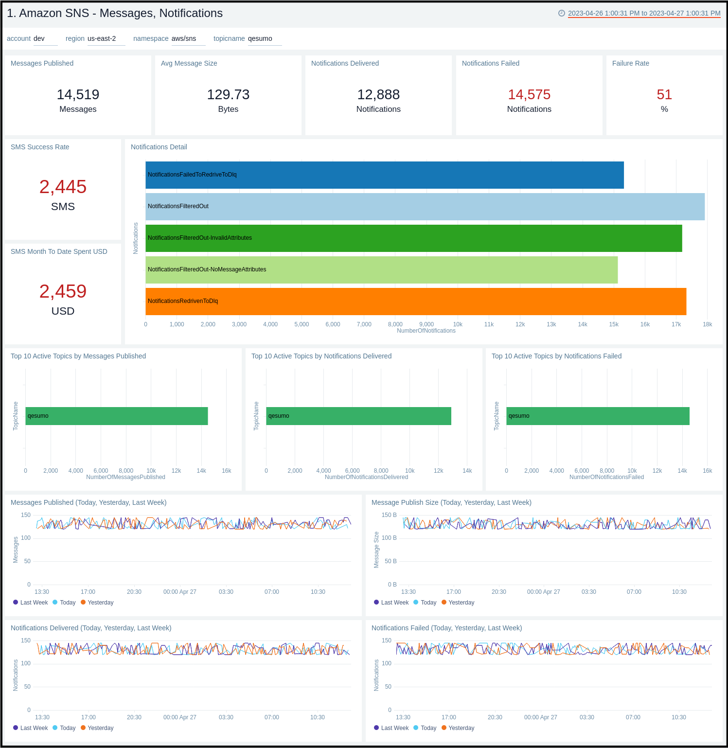 The Amazon SNS - Messages, Notifications dashboard provides insights across metrics by messages, notifications, SMS rates.