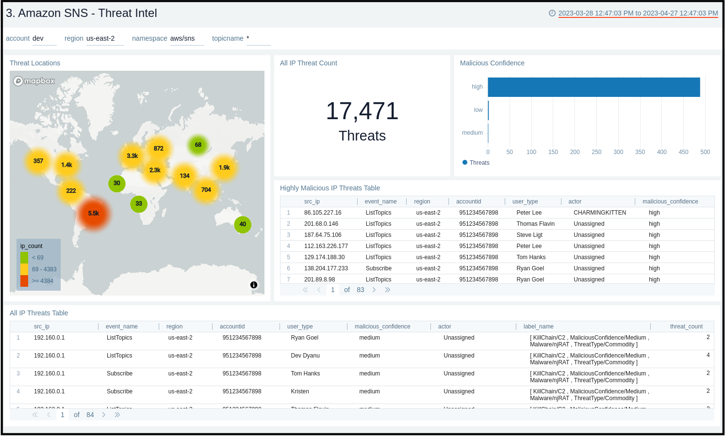 The Amazon SNS - Threat Intel dashboard provides insights across threat locations, count, malicious confidence and details.