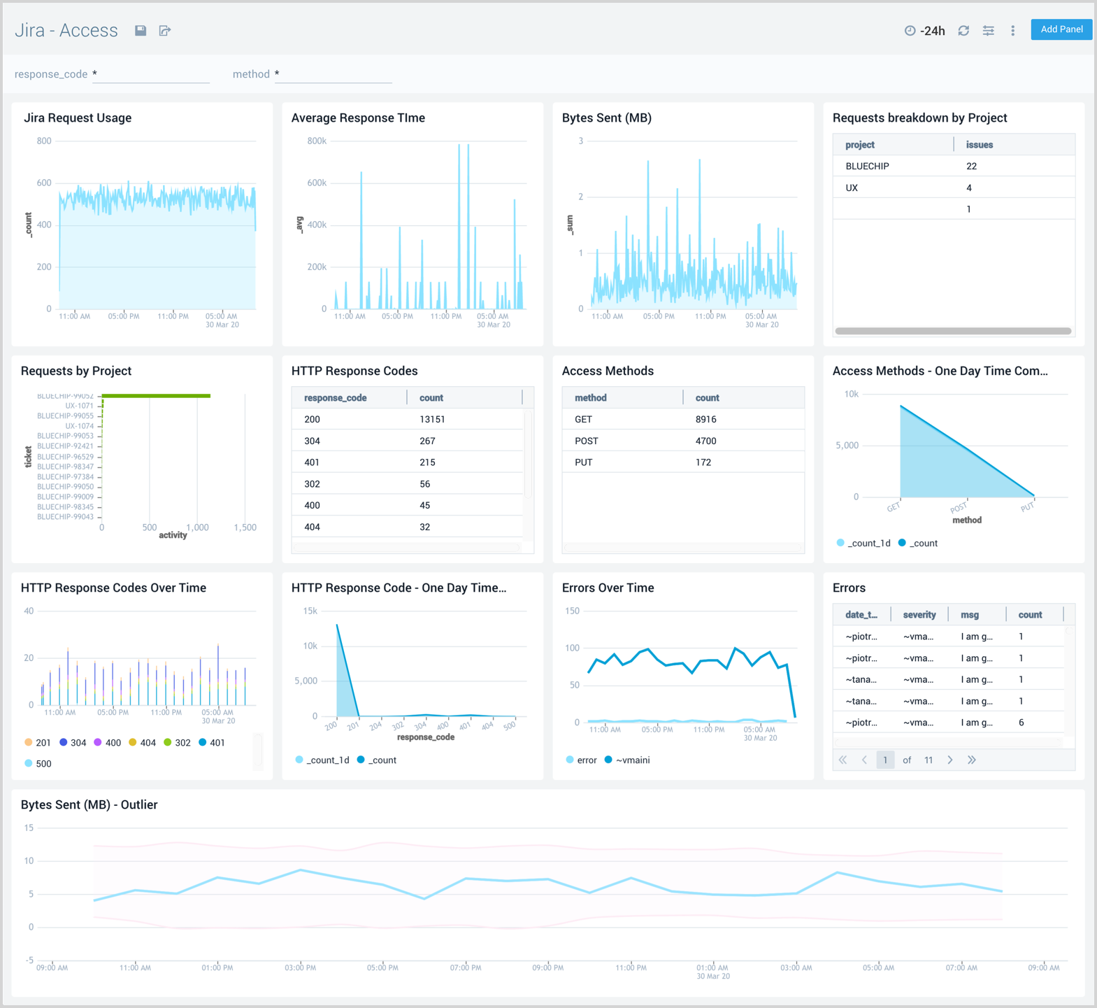 The Jira - Access dashboard provides information about Jira user access, including request trends, average response times, issues by project, response codes, and errors.