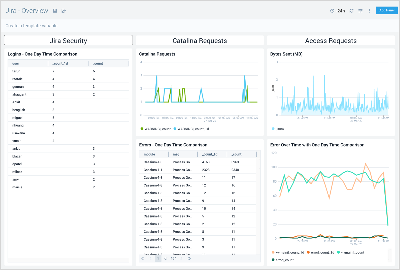 The Sumo Logic app for Jira provides insight into Jira usage, request activity, issues, security, sprint events, and user events.