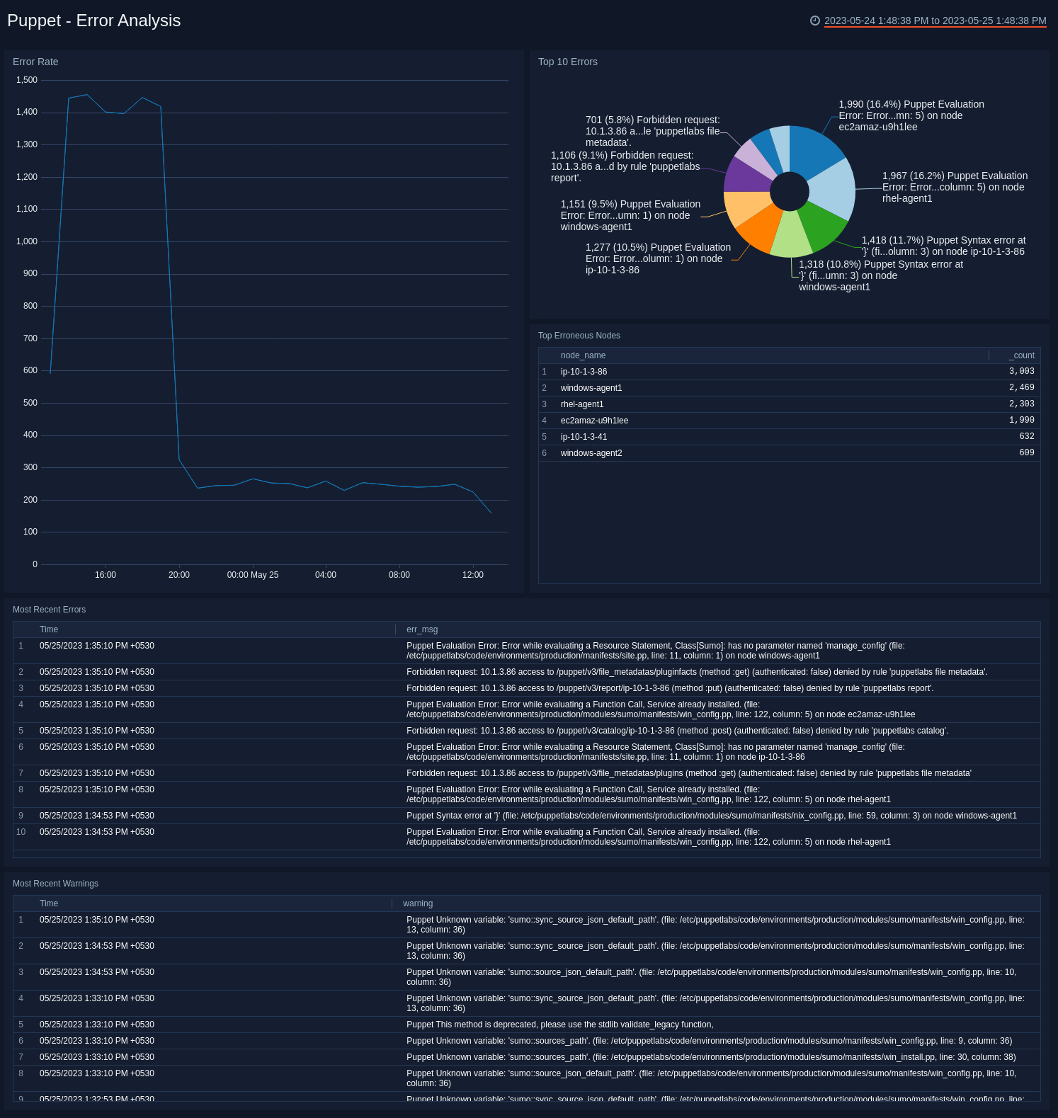 Puppet is a software configuration management tool. Puppet can provision infrastructure and enforce desired configurations across new and existing servers. The Sumo Logic app for Puppet helps you monitor Puppet metrics and events, which means that you can easily: