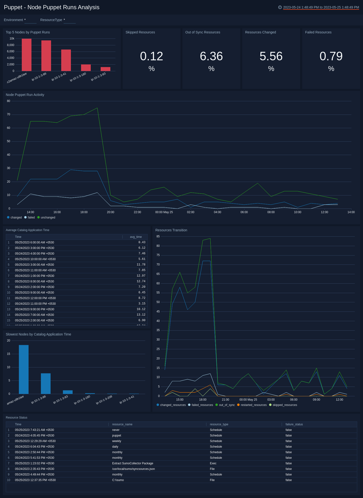 The sections below provide instructions for installing a collector on a Puppet Master host, setting up Sumo Puppet sources (server, access and reports logs), and installing the Sumo app for Puppet. With this configuration you can collect Puppet logs, events, and reports, and visualize resource performance and puppet runs data in the dashboards provided by the app.
