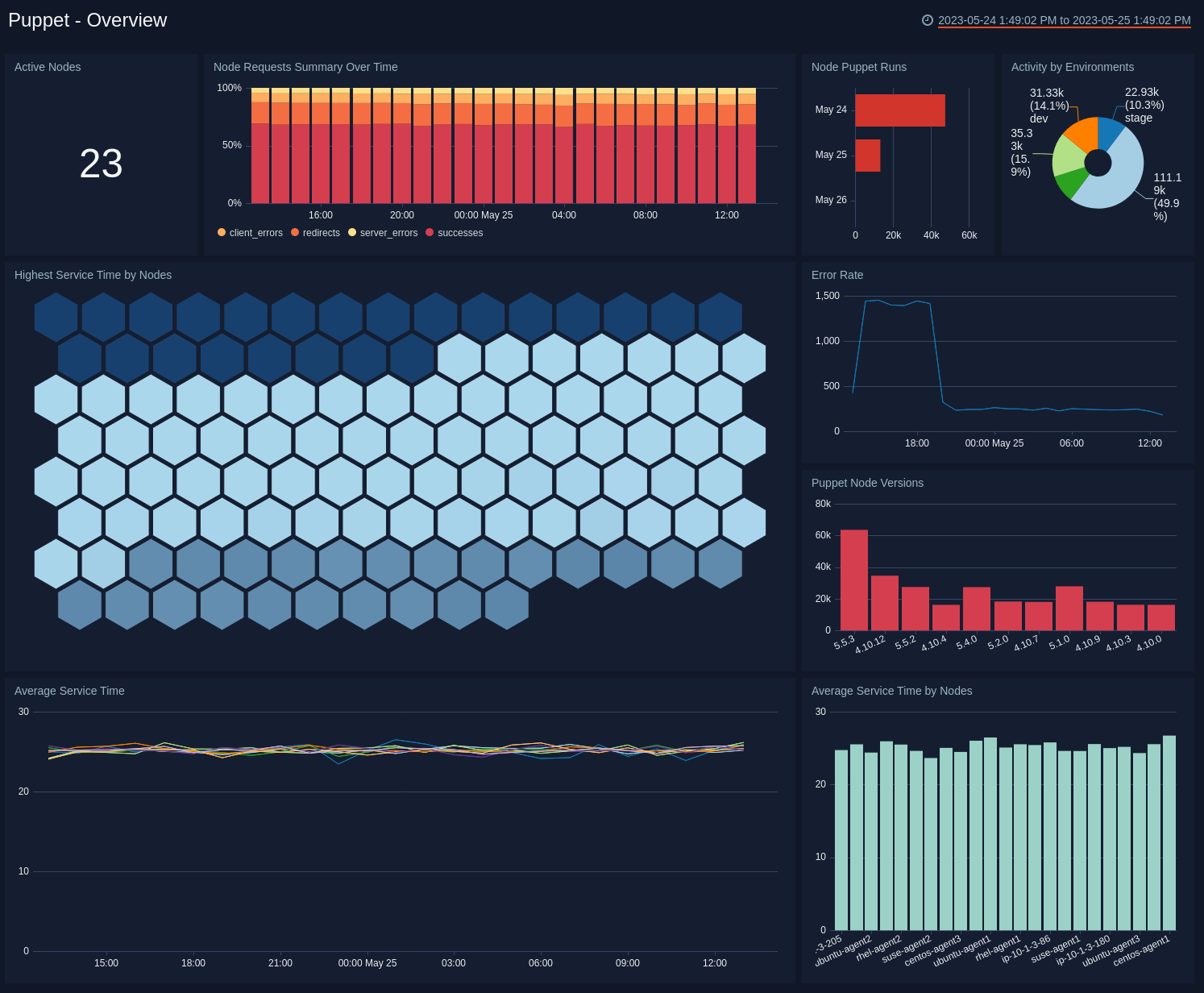 See an overview of Puppet activity, including puppet versions, environments, service times, unique nodes, nodes puppet runs, node requests and nodes responding.