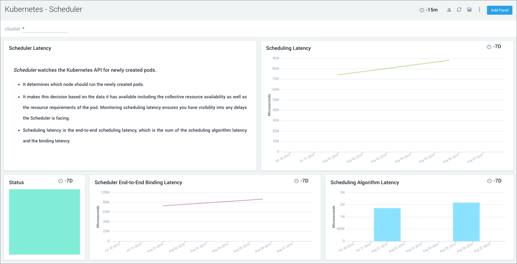 The Kubernetes - Scheduler dashboard provides insights into the health of the scheduler.