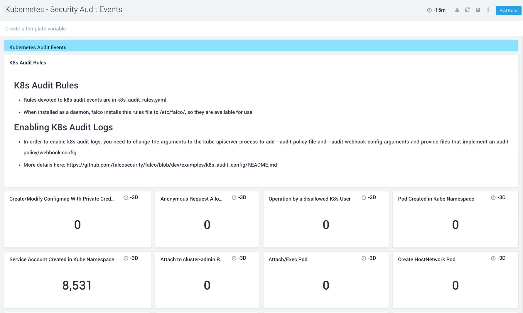The Kubernetes - Security Audit Events dashboard provides insights into Kubernetes audit events collected by Falco.