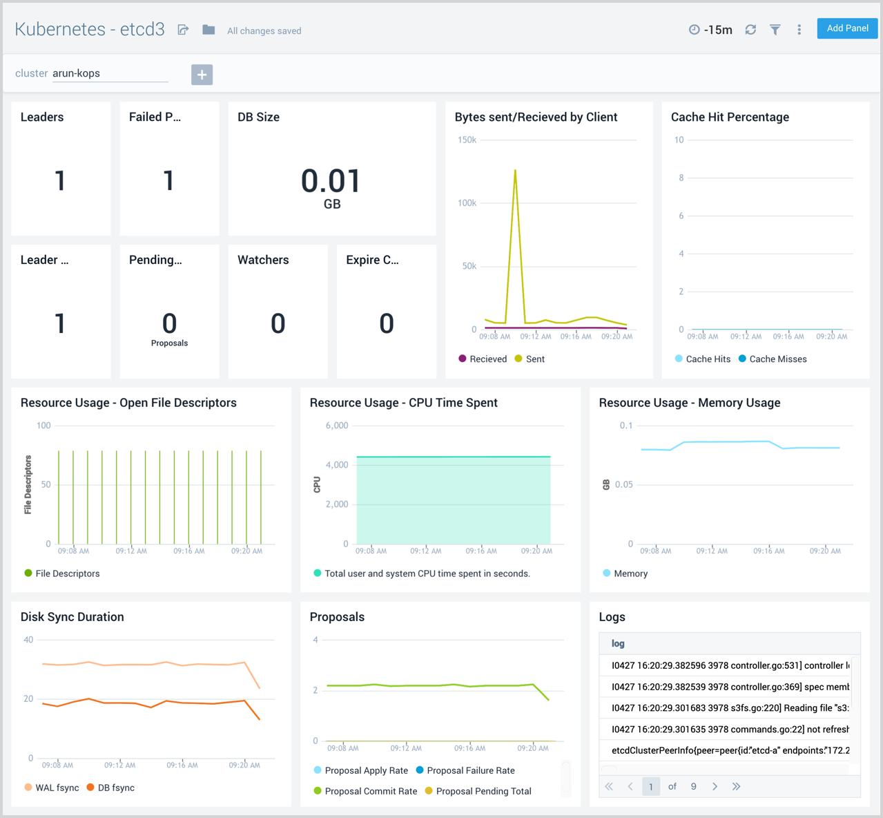 The Kubernetes - etcd3 dashboard provides information on the health of etcd, including resource usage, cache, proposals and leader changes.