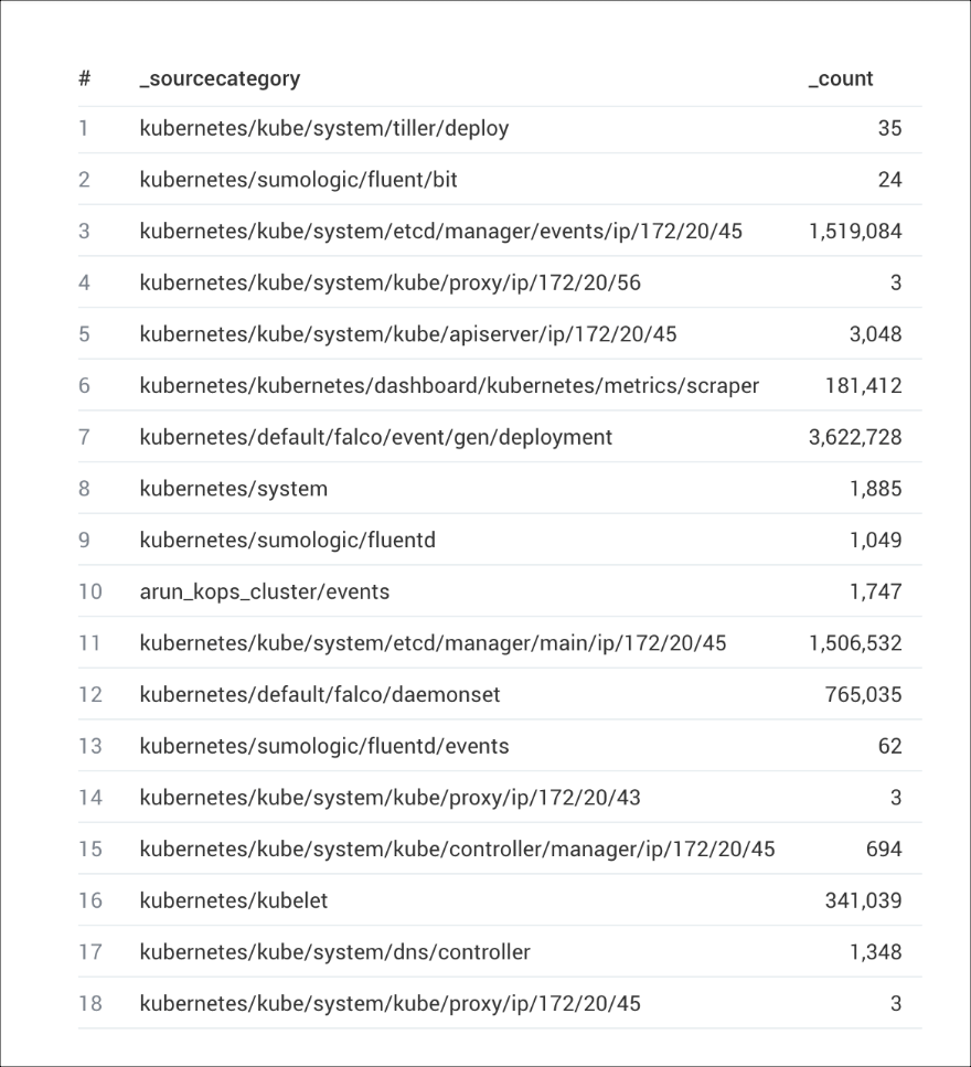 - Determine the custom data filters and source categories. The following table lists some of the sources created by the Sumo Logic Kubernetes Collection Helm Chart in the left column. The Source Category column contains the source category you should configure for the sources when you install the app, or the source category that matches your environment based on the output of the query (from the previous step).