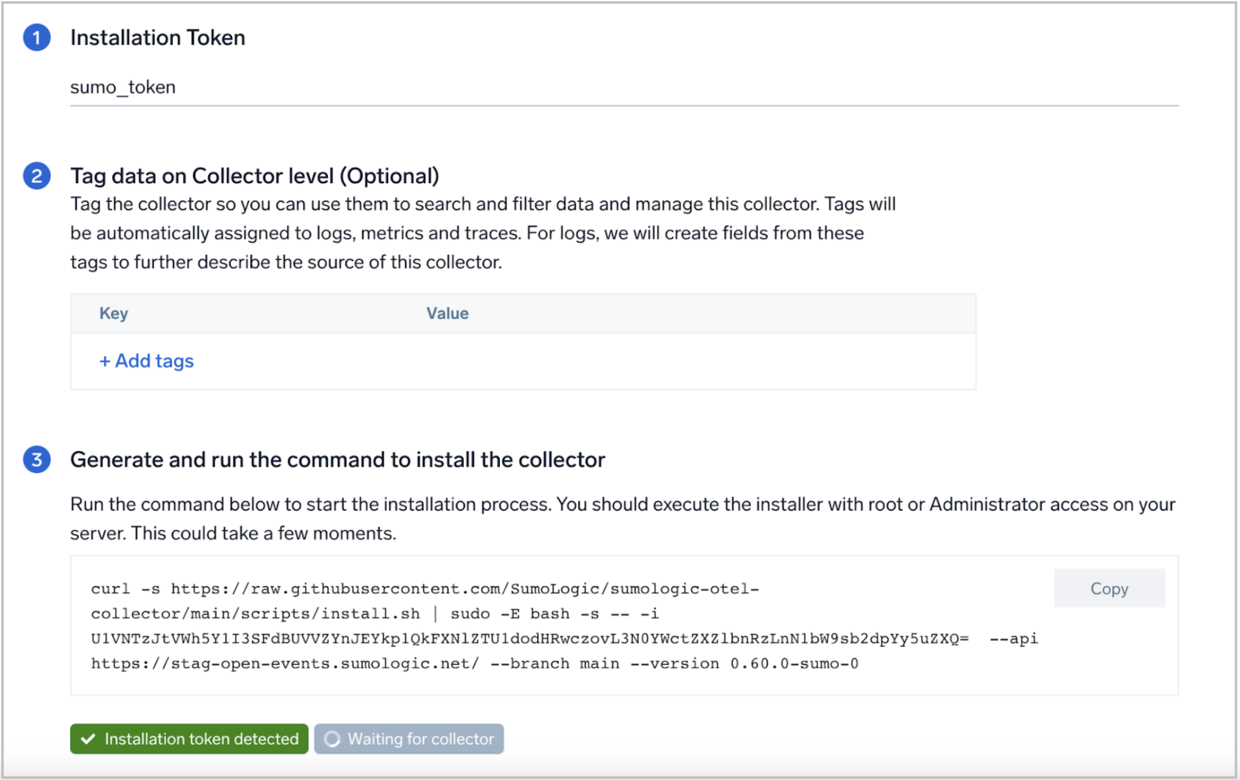 This will generate a command that you can execute in the machine environment you need to monitor. Once executed, it will install the Sumo Logic OpenTelemetry Collector.