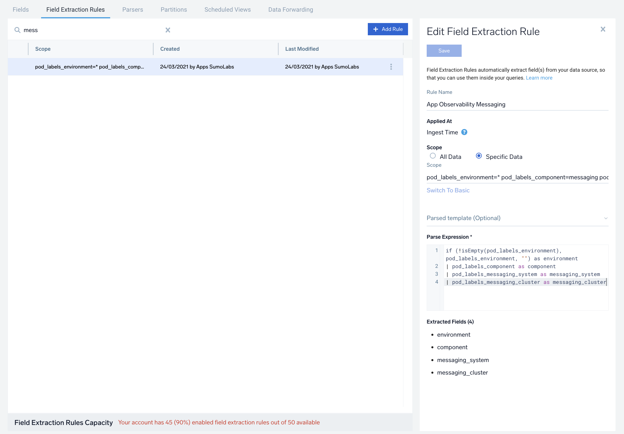 FER to normalize the fields in Kubernetes environments. Labels created in Kubernetes environments are automatically prefixed with pod_labels. To normalize these for our app to work, a Field Extraction Rule named AppObservabilityMessagingStrimziKafkaFER is automatically created for Strimzi Kafka Application Components.