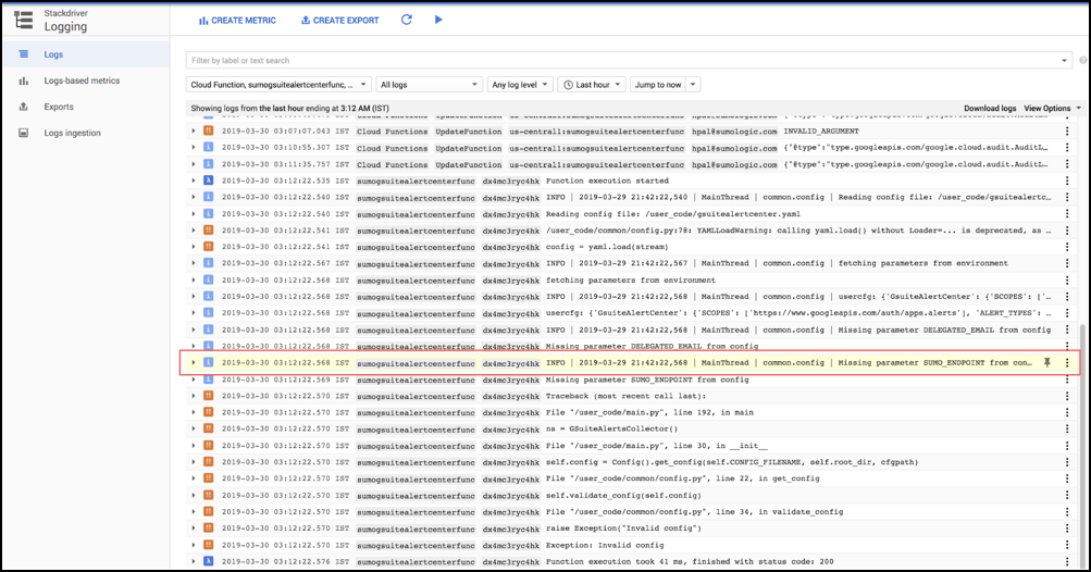 - Go to the gsuitealertcenterfunc google cloud function console.