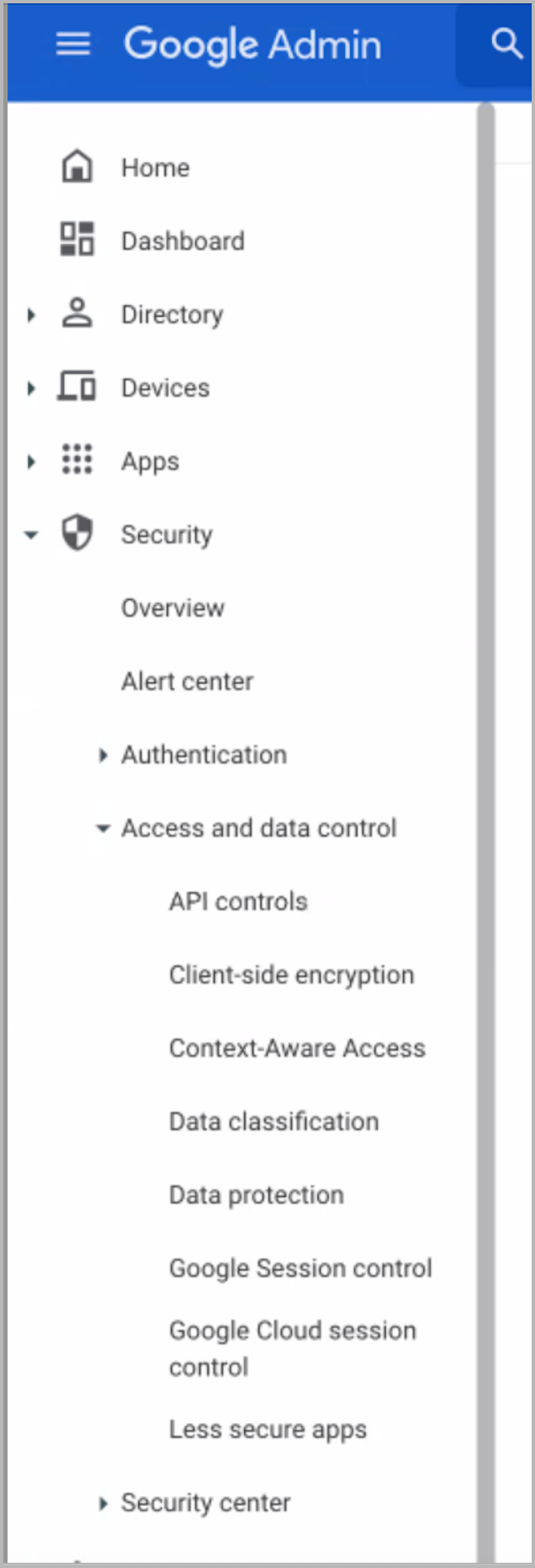- Go to your G Suite domain's Admin console (see instructions on signing in to your Admin console), go to Security > Access and data control > API Controls.