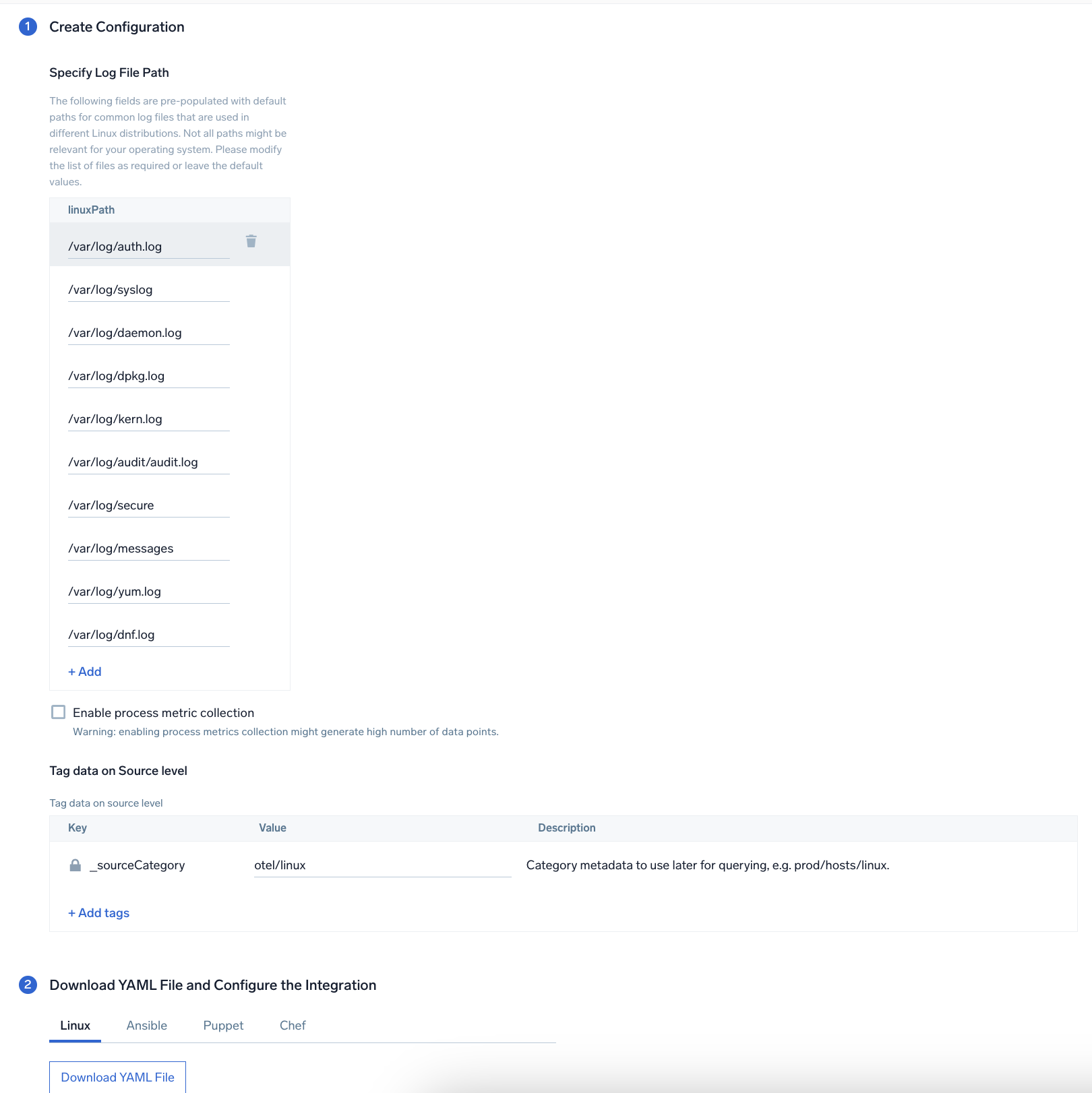 We use the Sumo Logic Distribution for OpenTelemetry Collector to collect Linux metrics and system logs. The OpenTelemetry collector runs on the Linux machine and uses the Host Metric Receiver to obtain Host and process metrics, and the Sumo Logic OpenTelemetry Exporter to send the metrics to Sumo Logic. Linux logs are sent to Sumo Logic through a filelog receiver.