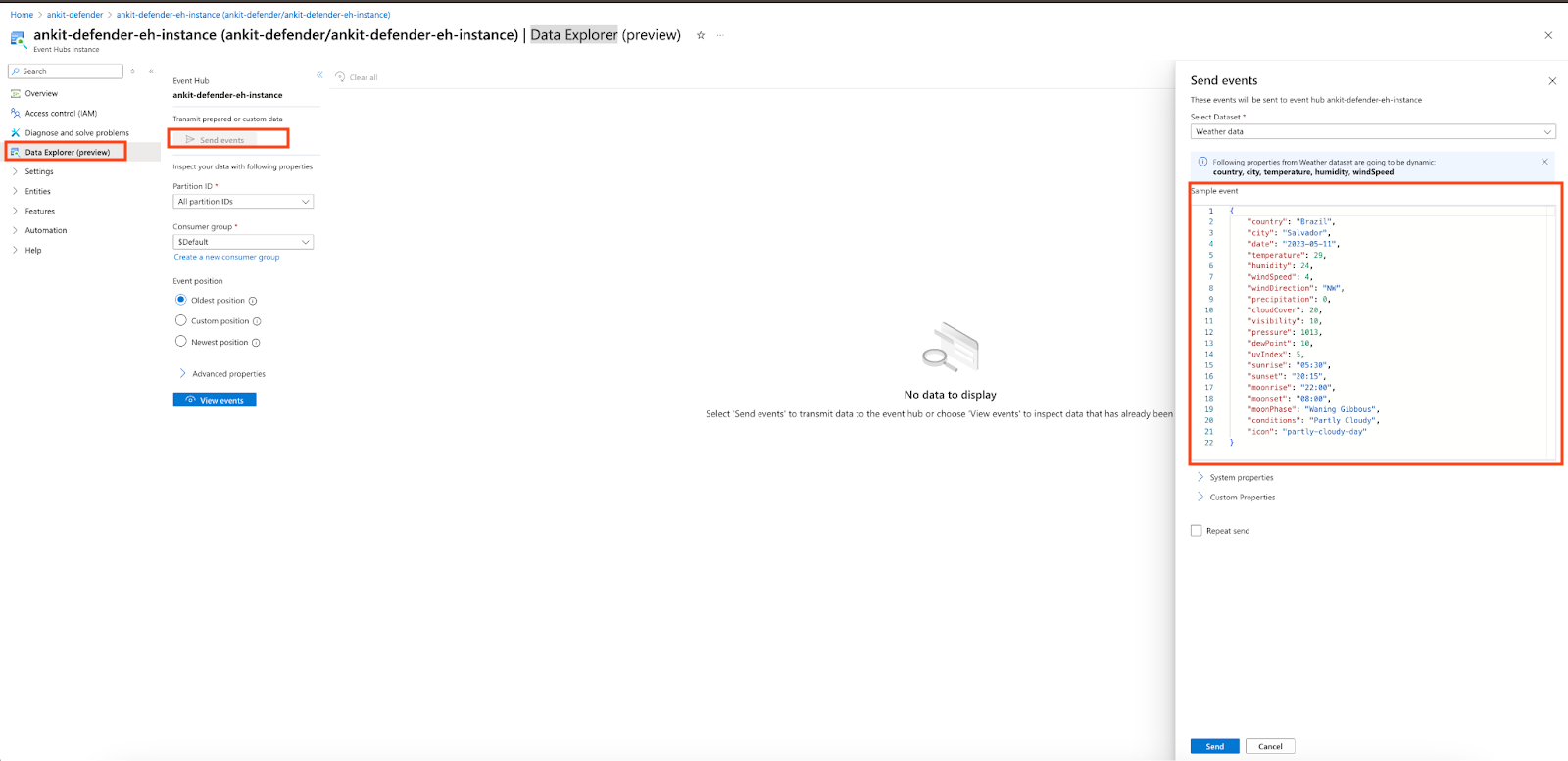 - In the Data Explorer (preview) page, click Send event and preview the sample events.