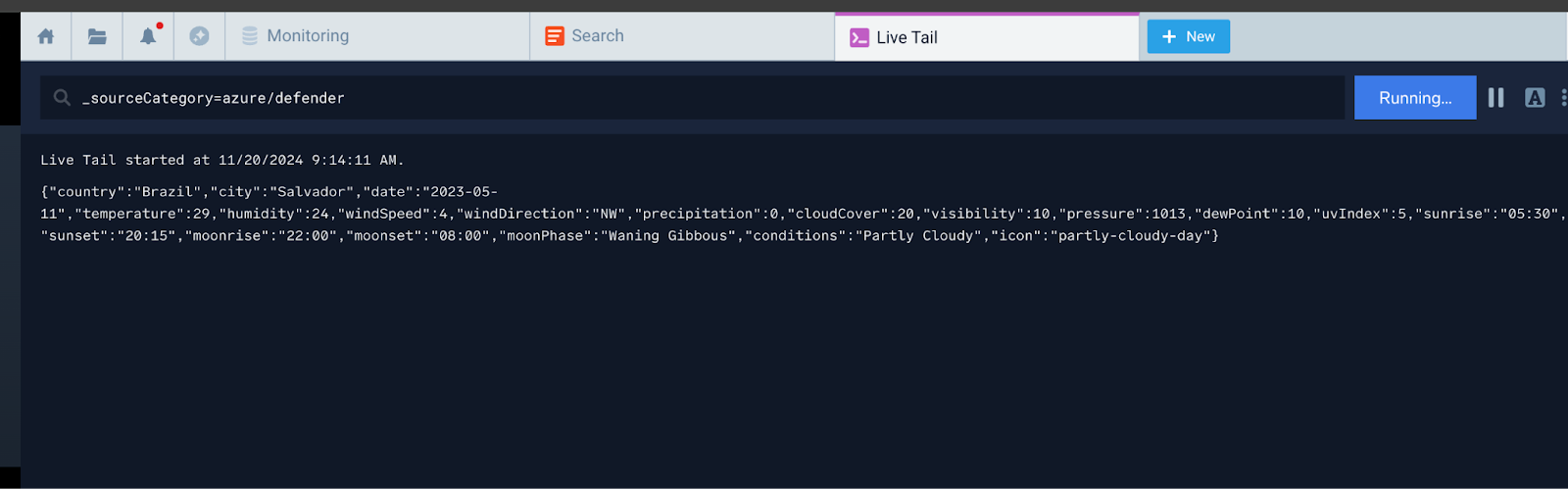 - Verify if those events are being sent to the Sumo Logic by Live Tailing. If the data matches, then the Event Hub instance will successfully send data to Sumo Logic.