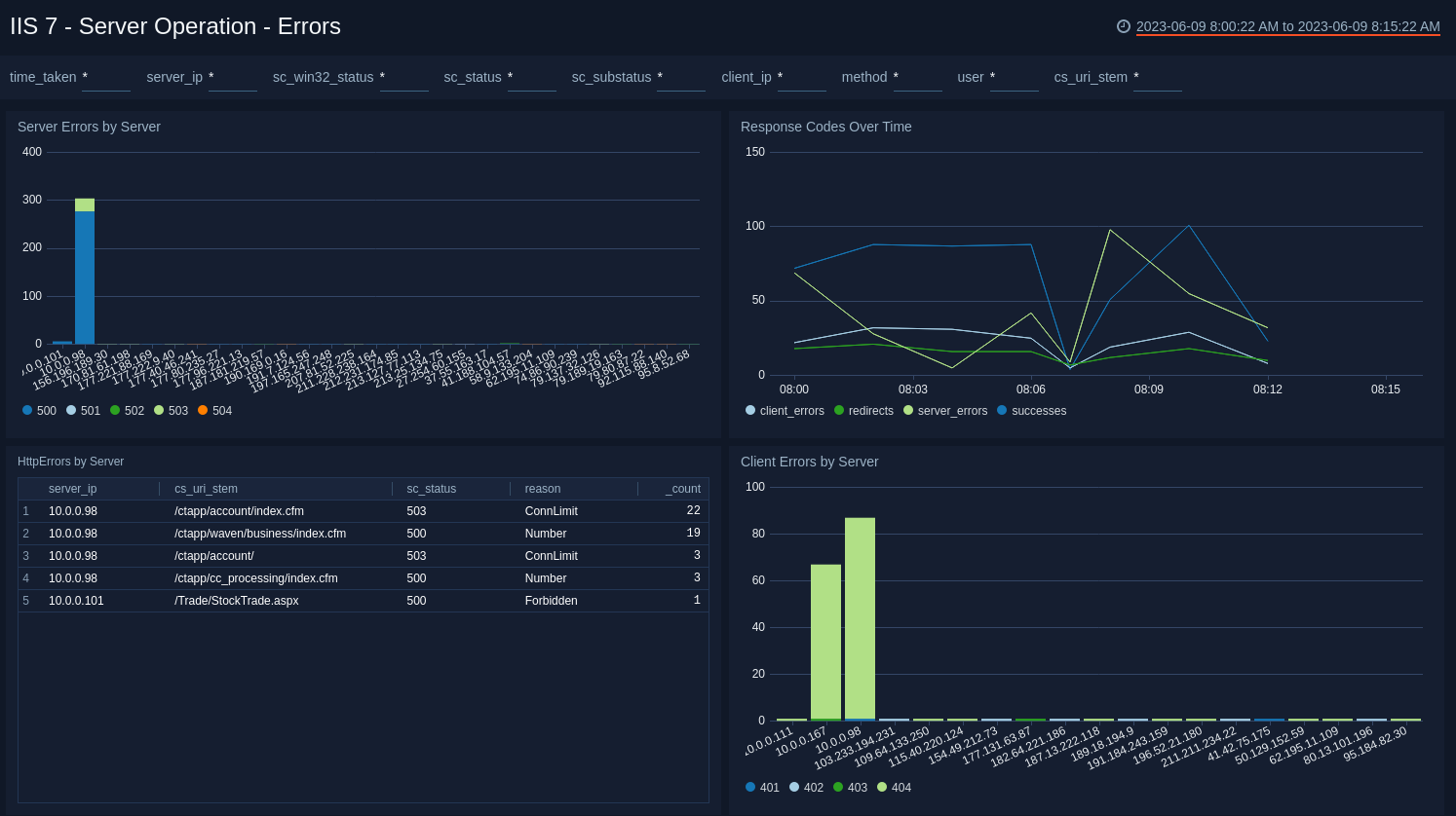 The IIS 7 - Server Operation - Errors Dashboard provides information on server errors by IP address, response code trends, HTTP errors by server IP address, and client errors by IP address.