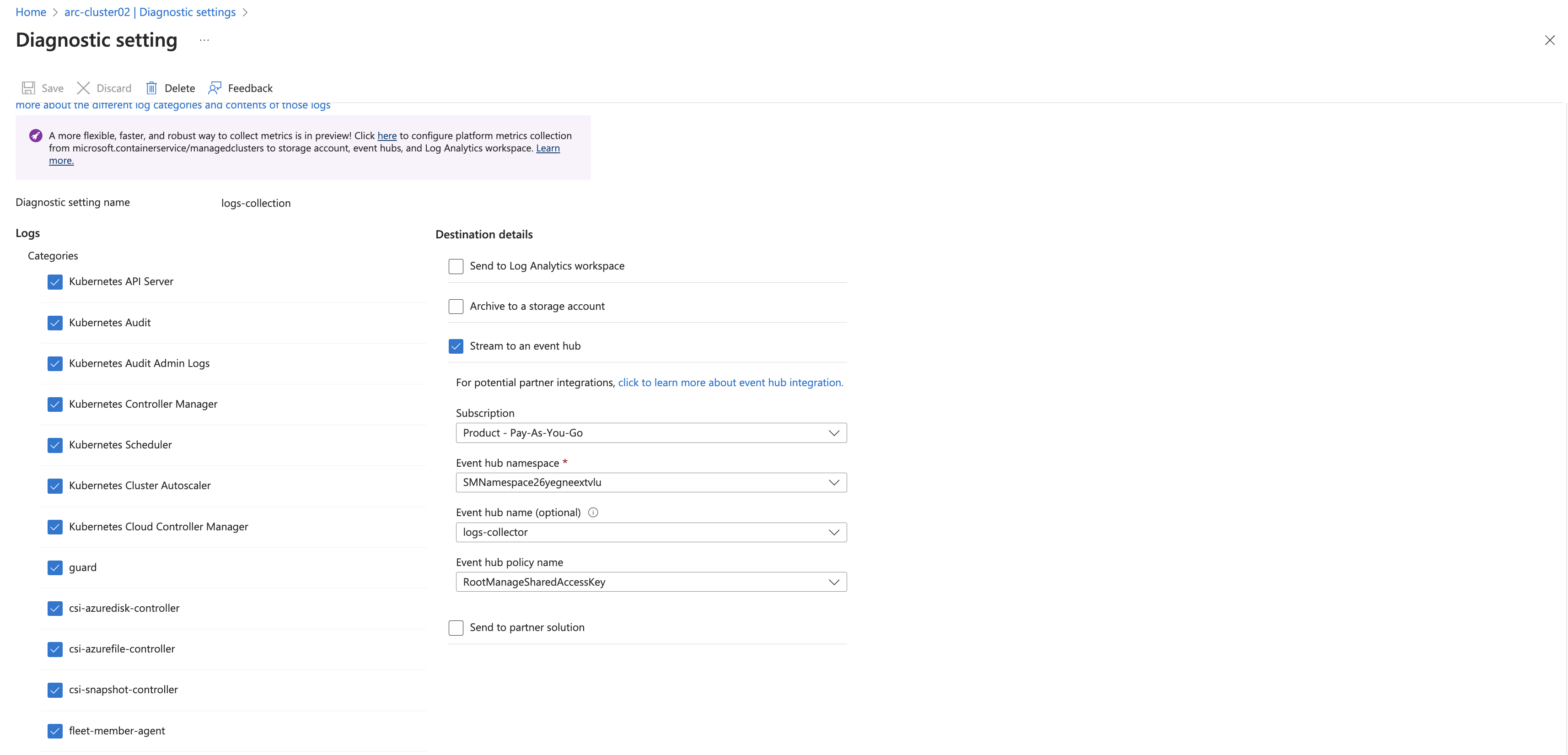 You must explicitly enable diagnostic settings for each Kubernetes Service you want to monitor. You can forward logs to the same Event Hub provided they satisfy the limitations and permissions as described here.